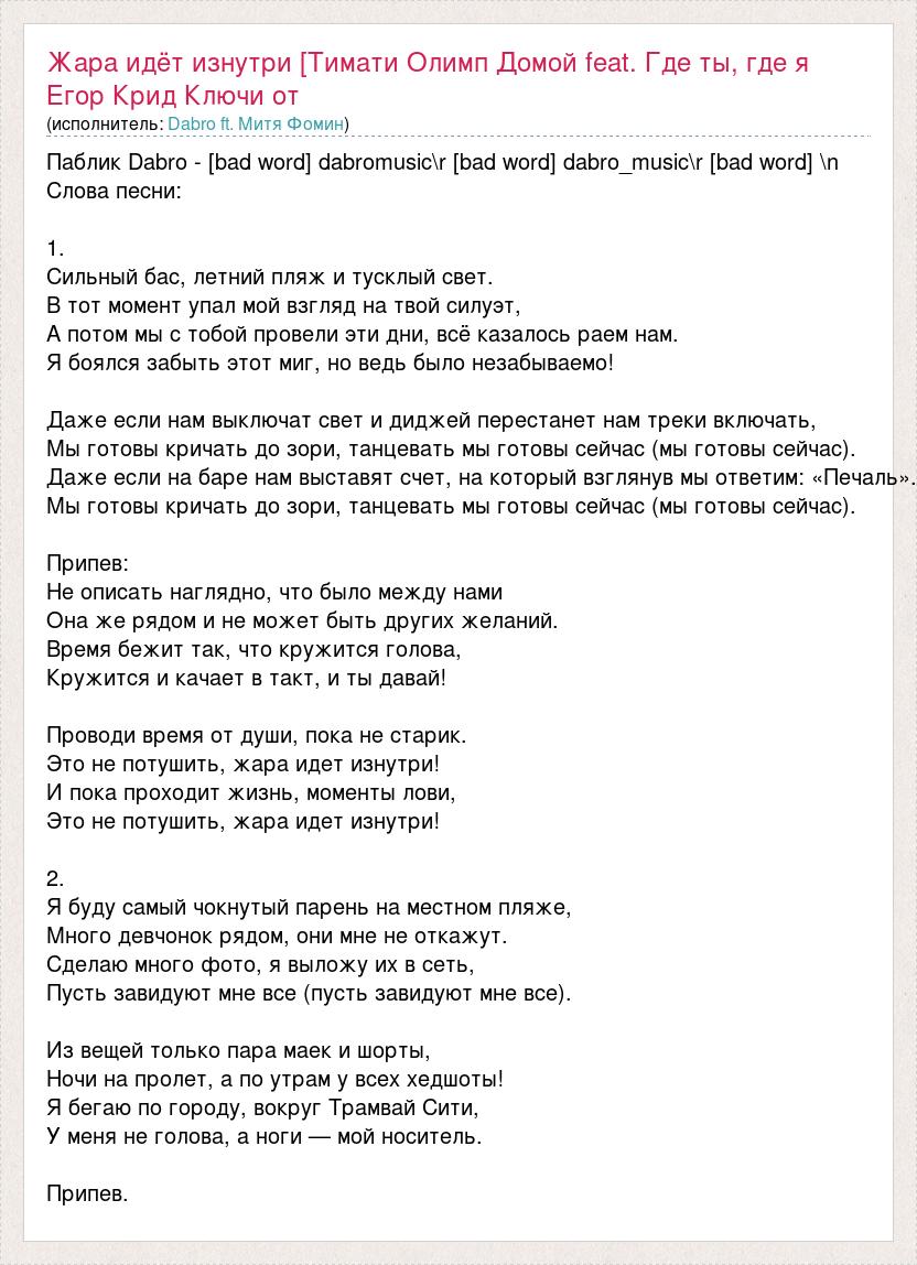 Паблик Dabro - [bad word] dabromusic [bad word] dabro_music [bad word] Слова песни: 1. Сильный бас, летний пляж и тусклый свет. В тот момент упал мой взгляд на твой силуэт, А потом мы с тобой провели эти дни, всё казалось раем нам. Я боялся забыть этот миг, но ведь было незабываемо! Даже если нам выключат свет и диджей перестанет нам треки включать, Мы готовы кричать до зори, танцевать мы готовы сейчас (мы готовы сейчас). Даже если на баре нам выставят счет, на который взглянув мы ответим: «Печаль». Мы готовы кричать до зори, танцевать мы готовы сейчас (мы готовы сейчас). Припев: Не описать наглядно, что было между нами Она же рядом и не может быть других желаний. Время бежит так, что кружится голова, Кружится и качает в такт, и ты давай! Проводи время от души, пока не старик. Это не потушить, жара идет изнутри! И пока проходит жизнь, моменты лови, Это не потушить, жара идет изнутри! 2. Я буду самый чокнутый парень на местном пляже, Много девчонок рядом, они мне не откажут. Сделаю много фото, я выложу их в сеть, Пусть завидуют мне все (пусть завидуют мне все). Из вещей только пара маек и шорты, Ночи на пролет, а по утрам у всех хедшоты! Я бегаю по городу, вокруг Трамвай Сити, У меня не голова, а ноги — мой носитель. Припев.