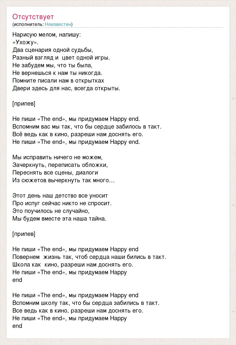 Нарисую мелом, напишу: «Ухожу». Два сценария одной судьбы, Разный взгляд и цвет одной игры. Не забудем мы, что ты была, Не вернешься к нам ты никогда. Помните писали нам в открытках Двери здесь для нас, всегда открыты. [припев] Не пиши «The end», мы придумаем Happy end. Вспомним вас мы так, что бы сердце забилось в такт. Всё ведь как в кино, разреши нам доснять его. Не пиши «The end», мы придумаем Happy end. Мы исправить ничего не можем, Зачеркнуть, переписать обложки, Переснять все сцены, диалоги Из сюжетов вычеркнуть так много… Этот день наш детство все уносит Про испуг сейчас никто не спросит. Это поучилось не случайно, Мы будем вместе эта наша тайна. [припев] Не пиши «The end», мы придумаем Happy end Повернем жизнь так, чтоб сердца наши бились в такт. Школа как кино, разреши нам доснять его. Не пиши «The end», мы придумаем Happy end Не пиши «The end», мы придумаем Happy end Вспомним школу так, что бы сердца забились в такт. Все ведь как в кино, разреши нам доснять его. Не пиши «The end», мы придумаем Happy end