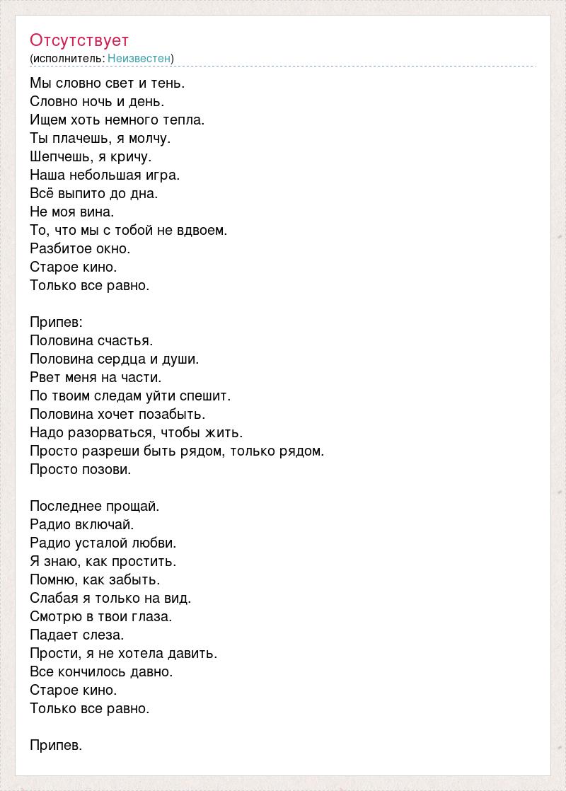 Мы словно свет и тень. Словно ночь и день. Ищем хоть немного тепла. Ты плачешь, я молчу. Шепчешь, я кричу. Наша небольшая игра. Всё выпито до дна. Не моя вина. То, что мы с тобой не вдвоем. Разбитое окно. Старое кино. Только все равно. Припев: Половина счастья. Половина сердца и души. Рвет меня на части. По твоим следам уйти спешит. Половина хочет позабыть. Надо разорваться, чтобы жить. Просто разреши быть рядом, только рядом. Просто позови. Последнее прощай. Радио включай. Радио усталой любви. Я знаю, как простить. Помню, как забыть. Слабая я только на вид. Смотрю в твои глаза. Падает слеза. Прости, я не хотела давить. Все кончилось давно. Старое кино. Только все равно. Припев.