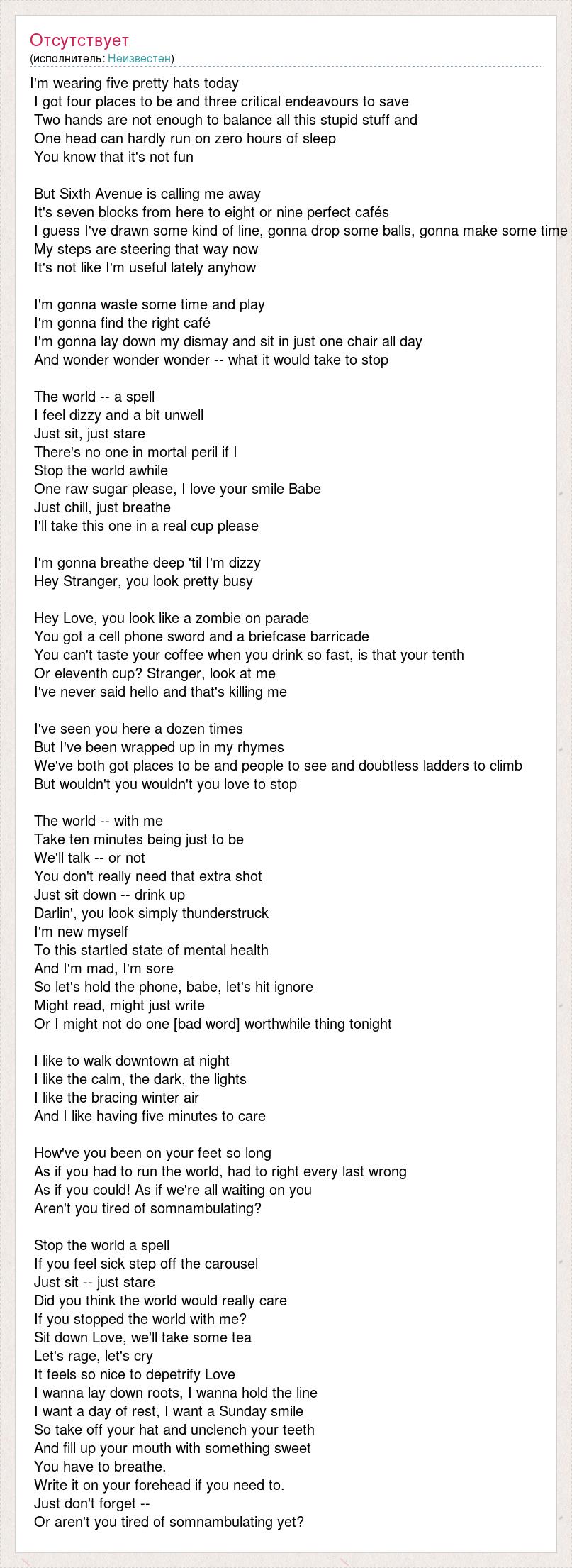 I'm wearing five pretty hats today I got four places to be and three critical endeavours to save Two hands are not enough to balance all this stupid stuff and One head can hardly run on zero hours of sleep You know that it's not fun But Sixth Avenue is calling me away It's seven blocks from here to eight or nine perfect cafés I guess I've drawn some kind of line, gonna drop some balls, gonna make some time My steps are steering that way now It's not like I'm useful lately anyhow I'm gonna waste some time and play I'm gonna find the right café I'm gonna lay down my dismay and sit in just one chair all day And wonder wonder wonder -- what it would take to stop The world -- a spell I feel dizzy and a bit unwell Just sit, just stare There's no one in mortal peril if I Stop the world awhile One raw sugar please, I love your smile Babe Just chill, just breathe I'll take this one in a real cup please I'm gonna breathe deep 'til I'm dizzy Hey Stranger, you look pretty busy Hey Love, you look like a zombie on parade You got a cell phone sword and a briefcase barricade You can't taste your coffee when you drink so fast, is that your tenth Or eleventh cup? Stranger, look at me I've never said hello and that's killing me I've seen you here a dozen times But I've been wrapped up in my rhymes We've both got places to be and people to see and doubtless ladders to climb But wouldn't you wouldn't you love to stop The world -- with me Take ten minutes being just to be We'll talk -- or not You don't really need that extra shot Just sit down -- drink up Darlin', you look simply thunderstruck I'm new myself To this startled state of mental health And I'm mad, I'm sore So let's hold the phone, babe, let's hit ignore Might read, might just write Or I might not do one [bad word] worthwhile thing tonight I like to walk downtown at night I like the calm, the dark, the lights I like the bracing winter air And I like having five minutes to care How've you been on your feet so long As if you had to run the world, had to right every last wrong As if you could! As if we're all waiting on you Aren't you tired of somnambulating? Stop the world a spell If you feel sick step off the carousel Just sit -- just stare Did you think the world would really care If you stopped the world with me? Sit down Love, we'll take some tea Let's rage, let's cry It feels so nice to depetrify Love I wanna lay down roots, I wanna hold the line I want a day of rest, I want a Sunday smile So take off your hat and unclench your teeth And fill up your mouth with something sweet You have to breathe. Write it on your forehead if you need to. Just don't forget -- Or aren't you tired of somnambulating yet?