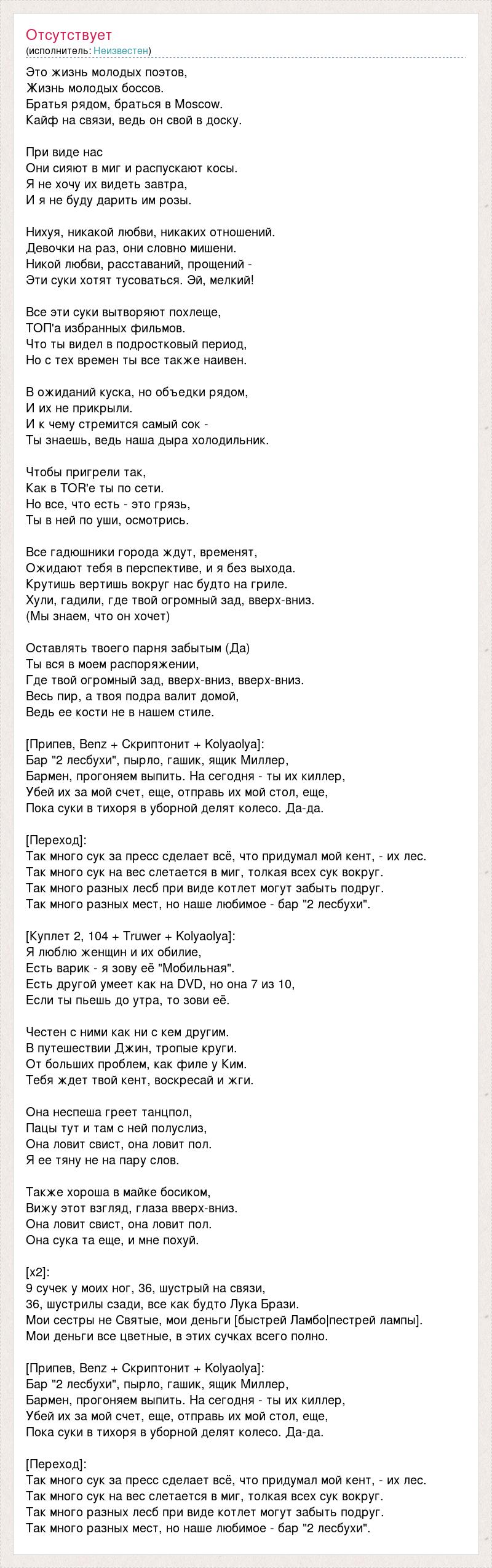 Это жизнь молодых поэтов, Жизнь молодых боссов. Братья рядом, браться в Moscow. Кайф на связи, ведь он свой в доску. При виде нас Они сияют в миг и распускают косы. Я не хочу их видеть завтра, И я не буду дарить им розы. Нихуя, никакой любви, никаких отношений. Девочки на раз, они словно мишени. Никой любви, расставаний, прощений - Эти суки хотят тусоваться. Эй, мелкий! Все эти суки вытворяют похлеще, ТОП'а избранных фильмов. Что ты видел в подростковый период, Но с тех времен ты все также наивен. В ожиданий куска, но объедки рядом, И их не прикрыли. И к чему стремится самый сок - Ты знаешь, ведь наша дыра холодильник. Чтобы пригрели так, Как в TOR'е ты по сети. Но все, что есть - это грязь, Ты в ней по уши, осмотрись. Все гадюшники города ждут, временят, Ожидают тебя в перспективе, и я без выхода. Крутишь вертишь вокруг нас будто на гриле. Хули, гадили, где твой огромный зад, вверх-вниз. (Мы знаем, что он хочет) Оставлять твоего парня забытым (Да) Ты вся в моем распоряжении, Где твой огромный зад, вверх-вниз, вверх-вниз. Весь пир, а твоя подра валит домой, Ведь ее кости не в нашем стиле. [Припев, Benz + Скриптонит + Kolyaolya]: Бар "2 лесбухи", пырло, гашик, ящик Миллер, Бармен, прогоняем выпить. На сегодня - ты их киллер, Убей их за мой счет, еще, отправь их мой стол, еще, Пока суки в тихоря в уборной делят колесо. Да-да. [Переход]: Так много сук за пресс сделает всё, что придумал мой кент, - их лес. Так много сук на вес слетается в миг, толкая всех сук вокруг. Так много разных лесб при виде котлет могут забыть подруг. Так много разных мест, но наше любимое - бар "2 лесбухи". [Куплет 2, 104 + Truwer + Kolyaolya]: Я люблю женщин и их обилие, Есть варик - я зову её "Мобильная". Есть другой умеет как на DVD, но она 7 из 10, Если ты пьешь до утра, то зови её. Честен с ними как ни с кем другим. В путешествии Джин, тропые круги. От больших проблем, как филе у Ким. Тебя ждет твой кент, воскресай и жги. Она неспеша греет танцпол, Пацы тут и там с ней полуслиз, Она ловит свист, она ловит пол. Я ее тяну не на пару слов. Также хороша в майке босиком, Вижу этот взгляд, глаза вверх-вниз. Она ловит свист, она ловит пол. Она сука та еще, и мне похуй. [х2]: 9 сучек у моих ног, 36, шустрый на связи, 36, шустрилы сзади, все как будто Лука Брази. Мои сестры не Святые, мои деньги [быстрей Ламбо|пестрей лампы]. Мои деньги все цветные, в этих сучках всего полно. [Припев, Benz + Скриптонит + Kolyaolya]: Бар "2 лесбухи", пырло, гашик, ящик Миллер, Бармен, прогоняем выпить. На сегодня - ты их киллер, Убей их за мой счет, еще, отправь их мой стол, еще, Пока суки в тихоря в уборной делят колесо. Да-да. [Переход]: Так много сук за пресс сделает всё, что придумал мой кент, - их лес. Так много сук на вес слетается в миг, толкая всех сук вокруг. Так много разных лесб при виде котлет могут забыть подруг. Так много разных мест, но наше любимое - бар "2 лесбухи".