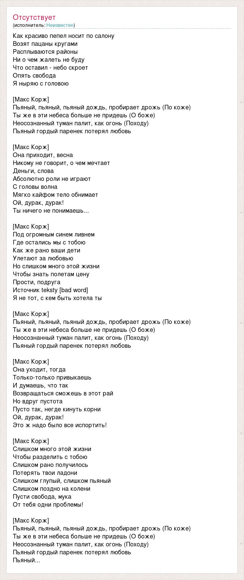Как красиво пепел носит по салону Возят пацаны кругами Расплываются районы Ни о чем жалеть не буду Что оставил - небо скроет Опять свобода Я ныряю с головою [Макс Корж] Пьяный, пьяный, пьяный дождь, пробирает дрожь (По коже) Ты же в эти небеса больше не придешь (О боже) Неосознанный туман палит, как огонь (Походу) Пьяный гордый паренек потерял любовь [Макс Корж] Она приходит, весна Никому не говорит, о чем мечтает Деньги, слова Абсолютно роли не играют С головы волна Мягко кайфом тело обнимает Ой, дурак, дурак! Ты ничего не понимаешь... [Макс Корж] Под огромным синем ливнем Где остались мы с тобою Как же рано ваши дети Улетают за любовью Но слишком много этой жизни Чтобы знать полетам цену Прости, подруга Источник teksty [bad word] Я не тот, с кем быть хотела ты [Макс Корж] Пьяный, пьяный, пьяный дождь, пробирает дрожь (По коже) Ты же в эти небеса больше не придешь (О боже) Неосознанный туман палит, как огонь (Походу) Пьяный гордый паренек потерял любовь [Макс Корж] Она уходит, тогда Только-только привыкаешь И думаешь, что так Возвращаться сможешь в этот рай Но вдруг пустота Пусто так, негде кинуть корни Ой, дурак, дурак! Это ж надо было все испортить! [Макс Корж] Слишком много этой жизни Чтобы разделить с тобою Слишком рано получилось Потерять твои ладони Слишком глупый, слишком пьяный Слишком поздно на колени Пусти свобода, мука От тебя одни проблемы! [Макс Корж] Пьяный, пьяный, пьяный дождь, пробирает дрожь (По коже) Ты же в эти небеса больше не придешь (О боже) Неосознанный туман палит, как огонь (Походу) Пьяный гордый паренек потерял любовь Пьяный...