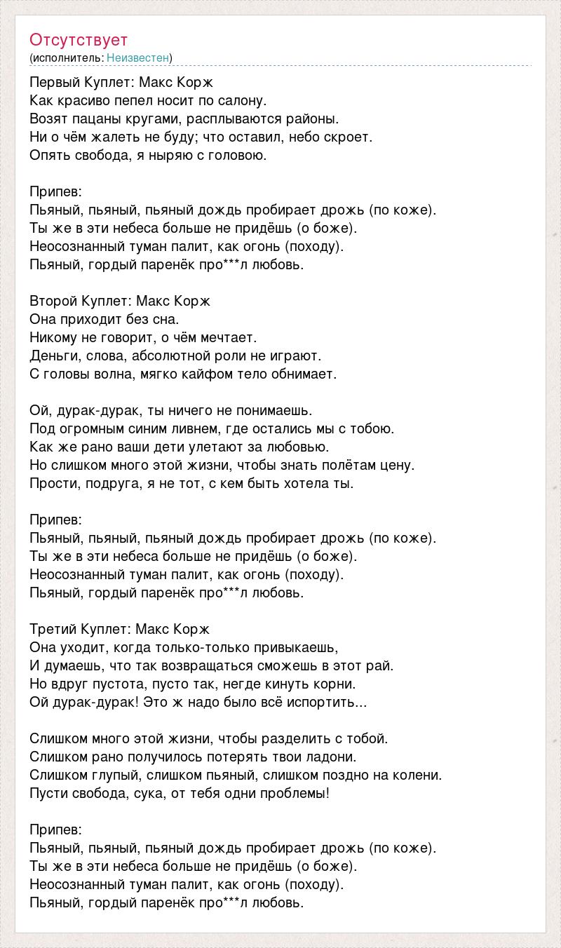 Первый Куплет: Макс Корж Как красиво пепел носит по салону. Возят пацаны кругами, расплываются районы. Ни о чём жалеть не буду; что оставил, небо скроет. Опять свобода, я ныряю с головою. Припев: Пьяный, пьяный, пьяный дождь пробирает дрожь (по коже). Ты же в эти небеса больше не придёшь (о боже). Неосознанный туман палит, как огонь (походу). Пьяный, гордый паренёк про***л любовь. Второй Куплет: Макс Корж Она приходит без сна. Никому не говорит, о чём мечтает. Деньги, слова, абсолютной роли не играют. С головы волна, мягко кайфом тело обнимает. Ой, дурак-дурак, ты ничего не понимаешь. Под огромным синим ливнем, где остались мы с тобою. Как же рано ваши дети улетают за любовью. Но слишком много этой жизни, чтобы знать полётам цену. Прости, подруга, я не тот, с кем быть хотела ты. Припев: Пьяный, пьяный, пьяный дождь пробирает дрожь (по коже). Ты же в эти небеса больше не придёшь (о боже). Неосознанный туман палит, как огонь (походу). Пьяный, гордый паренёк про***л любовь. Третий Куплет: Макс Корж Она уходит, когда только-только привыкаешь, И думаешь, что так возвращаться сможешь в этот рай. Но вдруг пустота, пусто так, негде кинуть корни. Ой дурак-дурак! Это ж надо было всё испортить... Слишком много этой жизни, чтобы разделить с тобой. Слишком рано получилось потерять твои ладони. Слишком глупый, слишком пьяный, слишком поздно на колени. Пусти свобода, сука, от тебя одни проблемы! Припев: Пьяный, пьяный, пьяный дождь пробирает дрожь (по коже). Ты же в эти небеса больше не придёшь (о боже). Неосознанный туман палит, как огонь (походу). Пьяный, гордый паренёк про***л любовь.