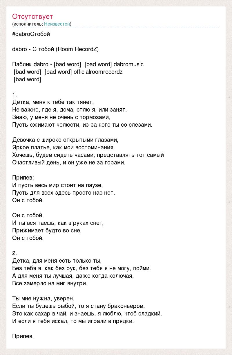#dabroСтобой dabro - С тобой (Room RecordZ) Паблик dabro - [bad word] [bad word] dabromusic [bad word] [bad word] officialroomrecordz [bad word] 1. Детка, меня к тебе так тянет, Не важно, где я, дома, сплю я, или занят. Знаю, у меня не очень с тормозами, Пусть сжимают челюсти, из-за кого ты со слезами. Девочка с широко открытыми глазами, Яркое платье, как мои воспоминания. Хочешь, будем сидеть часами, представлять тот самый Счастливый день, и он уже не за горами. Припев: И пусть весь мир стоит на паузе, Пусть для всех здесь просто нас нет. Он с тобой. Он с тобой. И ты вся таешь, как в руках снег, Прижимает будто во сне, Он с тобой. 2. Детка, для меня есть только ты, Без тебя я, как без рук, без тебя я не могу, пойми. А для меня ты лучшая, даже когда колючая, Все замерло на миг внутри. Ты мне нужна, уверен, Если ты будешь рыбой, то я стану браконьером. Это как сахар в чай, и знаешь, я люблю, чтоб сладкий. И если я тебя искал, то мы играли в прядки. Припев.
