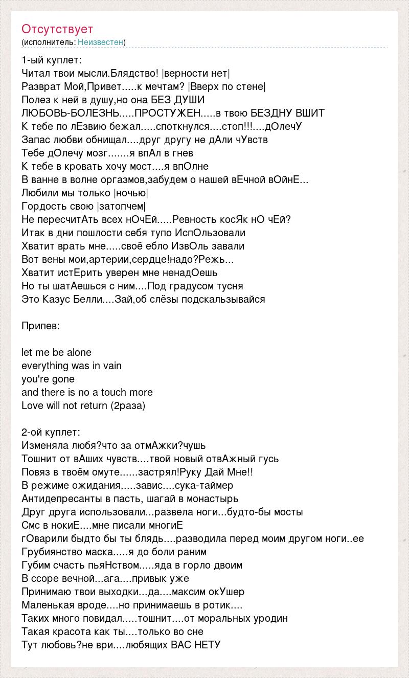 1-ый куплет: Читал твои мысли.Блядство! |верности нет| Разврат Мой,Привет.....к мечтам? |Вверх по стене| Полез к ней в душу,но она БЕЗ ДУШИ ЛЮБОВЬ-БОЛЕЗНЬ.....ПРОСТУЖЕН.....в твою БЕЗДНУ ВШИТ К тебе по лЕзвию бежал.....споткнулся....стоп!!!....дОлечУ Запас любви обнищал....друг другу не дАли чУвств Тебе дОлечу мозг.......я впАл в гнев К тебе в кровать хочу мост....я впОлне В ванне в волне оргазмов,забудем о нашей вЕчной вОйнЕ... Любили мы только |ночью| Гордость свою |затопчем| Не пересчитАть всех нОчЕй.....Ревность косЯк нО чЕй? Итак в дни пошлости себя тупо ИспОльзовали Хватит врать мне.....своё ебло ИзвОль завали Вот вены мои,артерии,сердце!надо?Режь... Хватит истЕрить уверен мне ненадОешь Но ты шатАешься с ним....Под градусом тусня Это Казус Белли....Зай,об слёзы подскальзывайся Припев: let me be alone everything was in vain you're gone and there is no a touch more Love will not return (2раза) 2-ой куплет: Изменяла любя?что за отмАжки?чушь Тошнит от вАших чувств....твой новый отвАжный гусь Повяз в твоём омуте......застрял!Руку Дай Мне!! В режиме ожидания.....завис....сука-таймер Антидепресанты в пасть, шагай в монастырь Друг друга использовали...развела ноги...будто-бы мосты Смс в нокиЕ....мне писали многиЕ гОварили быдто бы ты блядь....разводила перед моим другом ноги..ее Грубиянство маска.....я до боли раним Губим счасть пьяНством.....яда в горло двоим В ссоре вечной...ага....привык уже Принимаю твои выходки...да....максим окУшер Маленькая вроде....но принимаешь в ротик.... Таких много повидал.....тошнит....от моральных уродин Такая красота как ты....только во сне Тут любовь?не ври....любящих ВАС НЕТУ