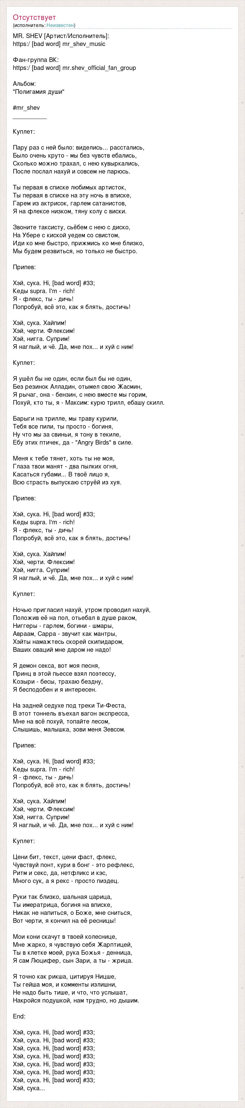 MR. SHEV [Артист/Исполнитель]: https:/ [bad word] mr_shev_music Фан-группа ВК: https:/ [bad word] mr.shev_official_fan_group Альбом: "Полигамия души" #mr_shev __________ Куплет: Пару раз с ней было: виделись... расстались, Было очень круто - мы без чувств ебались, Сколько можно трахал, с нею кувыркались, После послал нахуй и совсем не парюсь. Ты первая в списке любимых артисток, Ты первая в списке на эту ночь в вписке, Гарем из актрисок, гарлем сатанистов, Я на флексе низком, тяну колу с виски. Звоните таксисту, сьёбем с нею с диско, На Убере с киской уедем со свистом, Иди ко мне быстро, прижмись ко мне близко, Мы будем резвиться, но только не быстро. Припев: Хэй, сука. Hi, [bad word] #33; Кеды supra. I'm - rich! Я - флекс, ты - дичь! Попробуй, всё это, как я блять, достичь! Хэй, сука. Хайпим! Хэй, черти. Флексим! Хэй, нигга. Суприм! Я наглый, и чё. Да, мне пох... и хуй с ним! Куплет: Я ушёл бы не один, если был бы не один, Без резинок Алладин, отымел свою Жасмин, Я рычаг, она - бензин, с нею вместе мы горим, Похуй, кто ты, я - Максим: курю трилл, ебашу скилл. Барыги на трилле, мы траву курили, Тебя все пили, ты просто - богиня, Ну что мы за свиньи, я тону в текиле, Ебу этих птичек, да - "Angry Birds" в силе. Меня к тебе тянет, хоть ты не моя, Глаза твои манят - два пылких огня, Касаться губами... В твоё лицо я, Всю страсть выпускаю струёй из хуя. Припев: Хэй, сука. Hi, [bad word] #33; Кеды supra. I'm - rich! Я - флекс, ты - дичь! Попробуй, всё это, как я блять, достичь! Хэй, сука. Хайпим! Хэй, черти. Флексим! Хэй, нигга. Суприм! Я наглый, и чё. Да, мне пох... и хуй с ним! Куплет: Ночью пригласил нахуй, утром проводил нахуй, Положив её на пол, отьебал в душе раком, Ниггеры - гарлем, богини - шмары, Авраам, Сарра - звучит как мантры, Хэйты намажтесь скорей скипидаром, Ваших оваций мне даром не надо! Я демон секса, вот моя песня, Принц в этой пьессе взял поэтессу, Козыри - бесы, трахаю бездну, Я бесподобен и я интересен. На задней седухе под треки Ти-Феста, В этот тоннель въехал вагон экспресса, Мне на всё похуй, топайте лесом, Слышишь, малышка, зови меня Зевсом. Припев: Хэй, сука. Hi, [bad word] #33; Кеды supra. I'm - rich! Я - флекс, ты - дичь! Попробуй, всё это, как я блять, достичь! Хэй, сука. Хайпим! Хэй, черти. Флексим! Хэй, нигга. Суприм! Я наглый, и чё. Да, мне пох... и хуй с ним! Куплет: Цени бит, текст, цени фаст, флекс, Чувствуй понт, кури в бонг - это рефлекс, Ритм и секс, да, нетфликс и кэс, Много сук, а я рекс - просто пиздец. Руки так близко, шальная царица, Ты имератрица, богиня на вписке, Никак не напиться, о Боже, мне сниться, Вот черти, я кончил на её ресницы! Мои кони скачут в твоей колеснице, Мне жарко, я чувствую себя Жарптицей, Ты в клетке моей, рука Божья - денница, Я сам Люцифер, сын Зари, а ты - жрица. Я точно как рикша, цитируя Ницше, Ты гейша моя, и комменты излишни, Не надо быть тише, и что, что услышат, Накройся подушкой, нам трудно, но дышим. End: Хэй, сука. Hi, [bad word] #33; Хэй, сука. Hi, [bad word] #33; Хэй, сука. Hi, [bad word] #33; Хэй, сука. Hi, [bad word] #33; Хэй, сука. Hi, [bad word] #33; Хэй, сука. Hi, [bad word] #33; Хэй, сука. Hi, [bad word] #33; Хэй, сука...