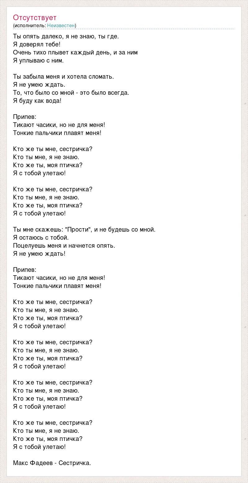 Ты опять далеко, я не знаю, ты где. Я доверял тебе! Очень тихо плывет каждый день, и за ним Я уплываю с ним. Ты забыла меня и хотела сломать. Я не умею ждать. То, что было со мной - это было всегда. Я буду как вода! Припев: Тикают часики, но не для меня! Тонкие пальчики плавят меня! Кто же ты мне, сестричка? Кто ты мне, я не знаю. Кто же ты, моя птичка? Я с тобой улетаю! Кто же ты мне, сестричка? Кто ты мне, я не знаю. Кто же ты, моя птичка? Я с тобой улетаю! Ты мне скажешь: "Прости", и не будешь со мной. Я остаюсь с тобой. Поцелуешь меня и начнется опять. Я не умею ждать! Припев: Тикают часики, но не для меня! Тонкие пальчики плавят меня! Кто же ты мне, сестричка? Кто ты мне, я не знаю. Кто же ты, моя птичка? Я с тобой улетаю! Кто же ты мне, сестричка? Кто ты мне, я не знаю. Кто же ты, моя птичка? Я с тобой улетаю! Кто же ты мне, сестричка? Кто ты мне, я не знаю. Кто же ты, моя птичка? Я с тобой улетаю! Кто же ты мне, сестричка? Кто ты мне, я не знаю. Кто же ты, моя птичка? Я с тобой улетаю! Макс Фадеев - Сестричка.