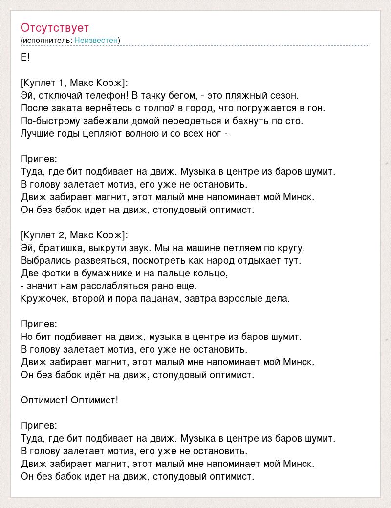 Е! [Куплет 1, Макс Корж]: Эй, отключай телефон! В тачку бегом, - это пляжный сезон. После заката вернётесь с толпой в город, что погружается в гон. По-быстрому забежали домой переодеться и бахнуть по сто. Лучшие годы цепляют волною и со всех ног - Припев: Туда, где бит подбивает на движ. Музыка в центре из баров шумит. В голову залетает мотив, его уже не остановить. Движ забирает магнит, этот малый мне напоминает мой Минск. Он без бабок идет на движ, стопудовый оптимист. [Куплет 2, Макс Корж]: Эй, братишка, выкрути звук. Мы на машине петляем по кругу. Выбрались развеяться, посмотреть как народ отдыхает тут. Две фотки в бумажнике и на пальце кольцо, - значит нам расслабляться рано еще. Кружочек, второй и пора пацанам, завтра взрослые дела. Припев: Но бит подбивает на движ, музыка в центре из баров шумит. В голову залетает мотив, его уже не остановить. Движ забирает магнит, этот малый мне напоминает мой Минск. Он без бабок идёт на движ, стопудовый оптимист. Оптимист! Оптимист! Припев: Туда, где бит подбивает на движ. Музыка в центре из баров шумит. В голову залетает мотив, его уже не остановить. Движ забирает магнит, этот малый мне напоминает мой Минск. Он без бабок идет на движ, стопудовый оптимист.