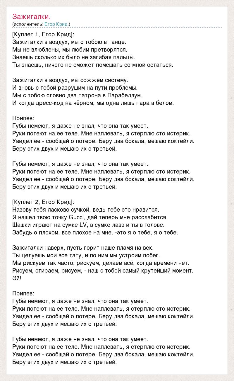 [Куплет 1, Егор Крид]: Зажигалки в воздух, мы с тобою в танце. Мы не влюблены, мы любим претворятся. Знаешь сколько их было не загибая пальцы. Ты знаешь, ничего не сможет помешать со мной остаться. Зажигалки в воздух, мы сожжём систему. И вновь с тобой разрушим на пути проблемы. Мы с тобою словно два патрона в Парабеллум. И когда дресс-код на чёрном, мы одна лишь пара в белом. Припев: Губы немеют, я даже не знал, что она так умеет. Руки потеют на ее теле. Мне наплевать, я стерплю сто истерик. Увидел ее - сообщай о потере. Беру два бокала, мешаю коктейли. Беру этих двух и мешаю их с третьей. Губы немеют, я даже не знал, что она так умеет. Руки потеют на ее теле. Мне наплевать, я стерплю сто истерик. Увидел ее - сообщай о потере. Беру два бокала, мешаю коктейли. Беру этих двух и мешаю их с третьей. [Куплет 2, Егор Крид]: Назову тебя ласково сучкой, ведь тебе это нравится. Я нашел твою точку Gucci, дай теперь мне расслабится. Шашки играют на сумке LV, в сумке лавэ и ты в голове. Забудь о плохом, все плохое на мне. -это я о тебе, я о тебе. Зажигалки наверх, пусть горит наше пламя на век. Ты целуешь мои все тату, и по ним мы устроим побег. Мы рискуем так часто, рискуем, делаем всё, когда времени нет. Рисуем, стираем, рисуем, - наш с тобой самый крутейший момент. Эй! Припев: Губы немеют, я даже не знал, что она так умеет. Руки потеют на ее теле. Мне наплевать, я стерплю сто истерик. Увидел ее - сообщай о потере. Беру два бокала, мешаю коктейли. Беру этих двух и мешаю их с третьей. Губы немеют, я даже не знал, что она так умеет. Руки потеют на ее теле. Мне наплевать, я стерплю сто истерик. Увидел ее - сообщай о потере. Беру два бокала, мешаю коктейли. Беру этих двух и мешаю их с третьей.