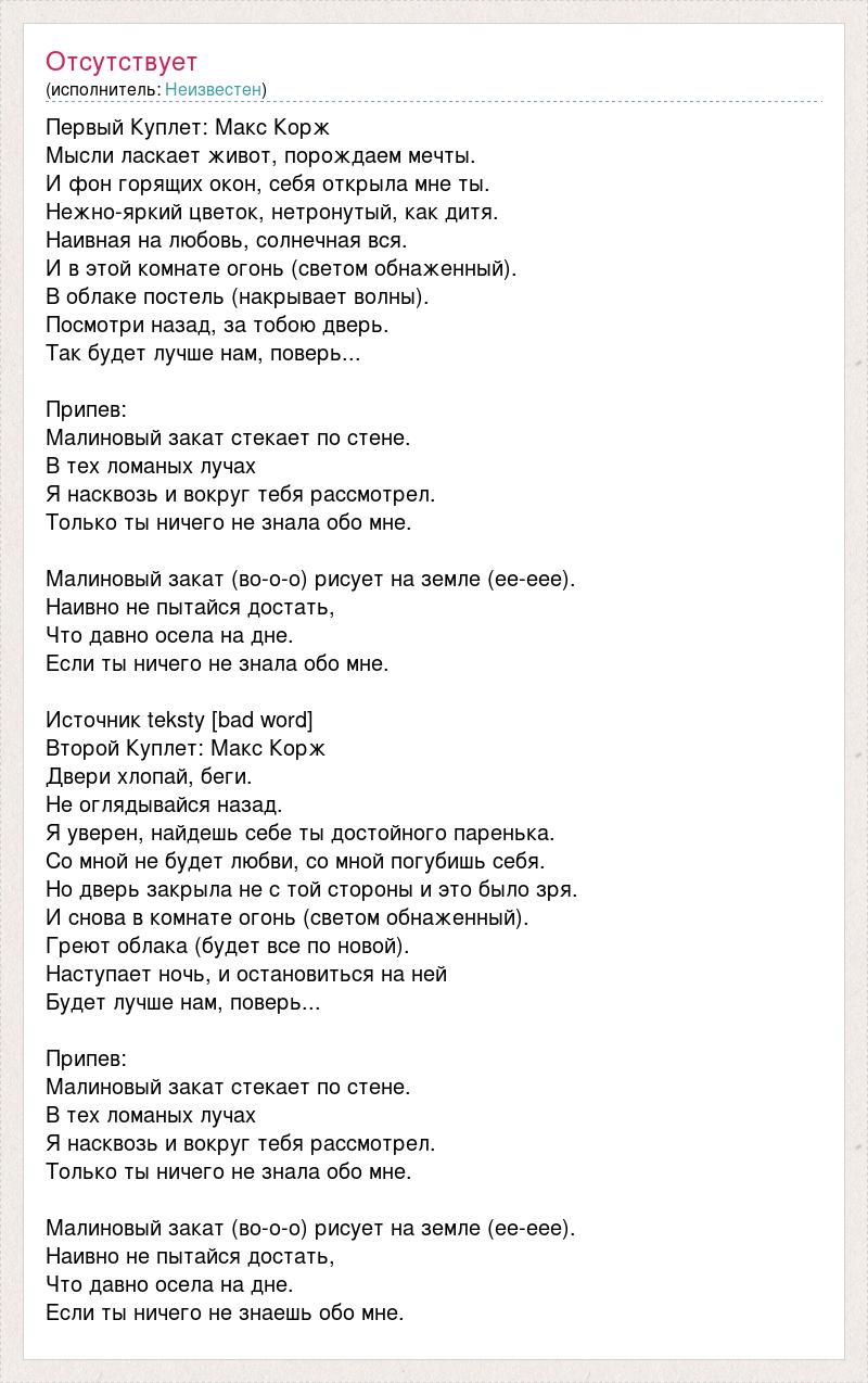 Первый Куплет: Макс Корж Мысли ласкает живот, порождаем мечты. И фон горящих окон, себя открыла мне ты. Нежно-яркий цветок, нетронутый, как дитя. Наивная на любовь, солнечная вся. И в этой комнате огонь (светом обнаженный). В облаке постель (накрывает волны). Посмотри назад, за тобою дверь. Так будет лучше нам, поверь... Припев: Малиновый закат стекает по стене. В тех ломаных лучах Я насквозь и вокруг тебя рассмотрел. Только ты ничего не знала обо мне. Малиновый закат (во-о-о) рисует на земле (ее-еее). Наивно не пытайся достать, Что давно осела на дне. Если ты ничего не знала обо мне. Источник teksty [bad word] Второй Куплет: Макс Корж Двери хлопай, беги. Не оглядывайся назад. Я уверен, найдешь себе ты достойного паренька. Со мной не будет любви, со мной погубишь себя. Но дверь закрыла не с той стороны и это было зря. И снова в комнате огонь (светом обнаженный). Греют облака (будет все по новой). Наступает ночь, и остановиться на ней Будет лучше нам, поверь... Припев: Малиновый закат стекает по стене. В тех ломаных лучах Я насквозь и вокруг тебя рассмотрел. Только ты ничего не знала обо мне. Малиновый закат (во-о-о) рисует на земле (ее-еее). Наивно не пытайся достать, Что давно осела на дне. Если ты ничего не знаешь обо мне.