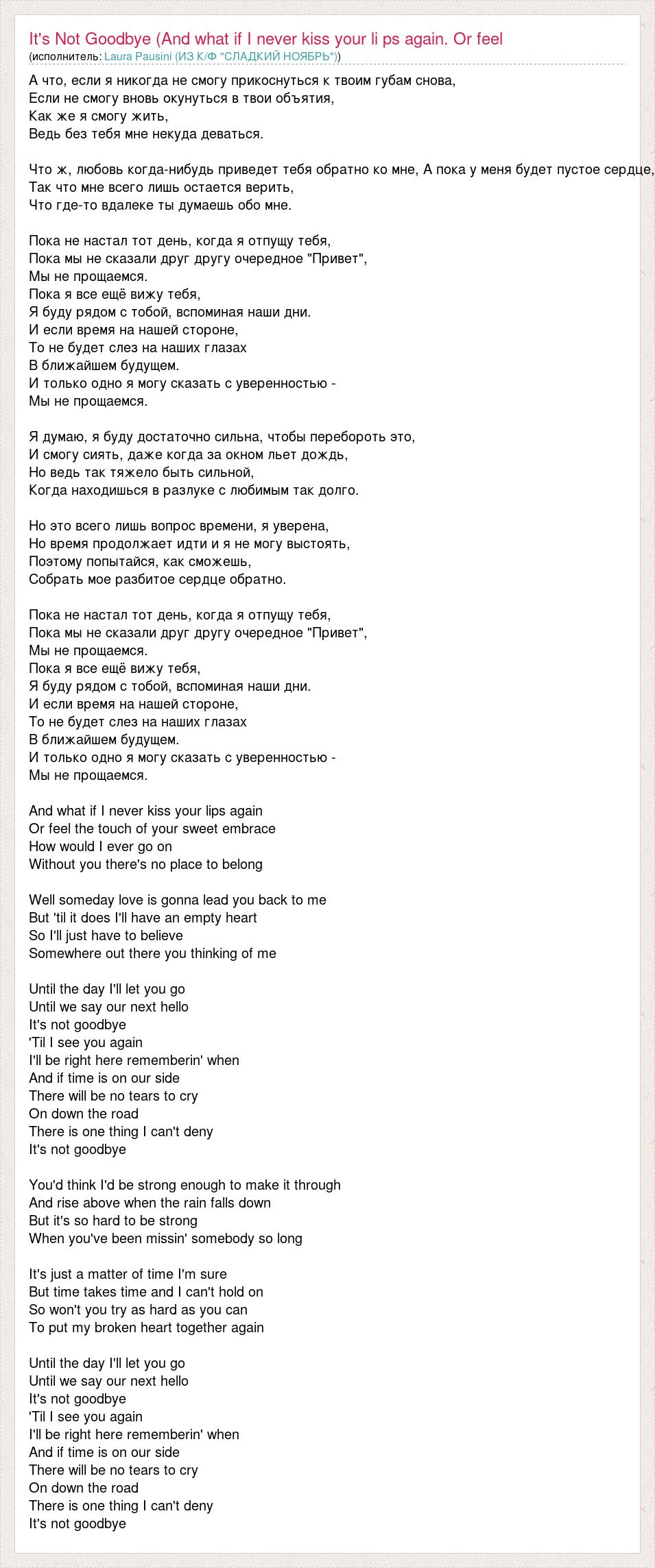А что, если я никогда не смогу прикоснуться к твоим губам снова, Если не смогу вновь окунуться в твои объятия, Как же я смогу жить, Ведь без тебя мне некуда деваться. Что ж, любовь когда-нибудь приведет тебя обратно ко мне, А пока у меня будет пустое сердце, Так что мне всего лишь остается верить, Что где-то вдалеке ты думаешь обо мне. Пока не настал тот день, когда я отпущу тебя, Пока мы не сказали друг другу очередное "Привет", Мы не прощаемся. Пока я все ещё вижу тебя, Я буду рядом с тобой, вспоминая наши дни. И если время на нашей стороне, То не будет слез на наших глазах В ближайшем будущем. И только одно я могу сказать с уверенностью - Мы не прощаемся. Я думаю, я буду достаточно сильна, чтобы перебороть это, И смогу сиять, даже когда за окном льет дождь, Но ведь так тяжело быть сильной, Когда находишься в разлуке с любимым так долго. Но это всего лишь вопрос времени, я уверена, Но время продолжает идти и я не могу выстоять, Поэтому попытайся, как сможешь, Собрать мое разбитое сердце обратно. Пока не настал тот день, когда я отпущу тебя, Пока мы не сказали друг другу очередное "Привет", Мы не прощаемся. Пока я все ещё вижу тебя, Я буду рядом с тобой, вспоминая наши дни. И если время на нашей стороне, То не будет слез на наших глазах В ближайшем будущем. И только одно я могу сказать с уверенностью - Мы не прощаемся. And what if I never kiss your lips again Or feel the touch of your sweet embrace How would I ever go on Without you there's no place to belong Well someday love is gonna lead you back to me But 'til it does I'll have an empty heart So I'll just have to believe Somewhere out there you thinking of me Until the day I'll let you go Until we say our next hello It's not goodbye 'Til I see you again I'll be right here rememberin' when And if time is on our side There will be no tears to cry On down the road There is one thing I can't deny It's not goodbye You'd think I'd be strong enough to make it through And rise above when the rain falls down But it's so hard to be strong When you've been missin' somebody so long It's just a matter of time I'm sure But time takes time and I can't hold on So won't you try as hard as you can To put my broken heart together again Until the day I'll let you go Until we say our next hello It's not goodbye 'Til I see you again I'll be right here rememberin' when And if time is on our side There will be no tears to cry On down the road There is one thing I can't deny It's not goodbye