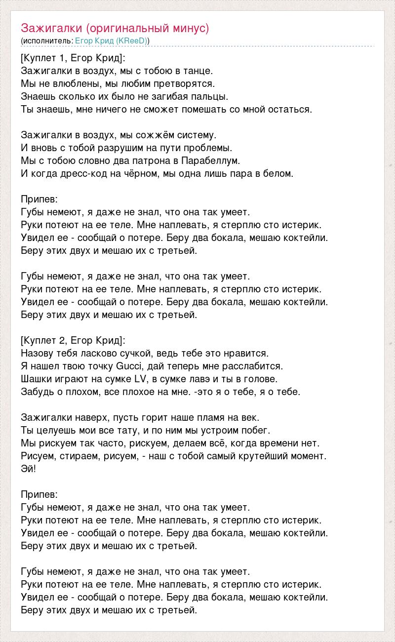 [Куплет 1, Егор Крид]: Зажигалки в воздух, мы с тобою в танце. Мы не влюблены, мы любим претворятся. Знаешь сколько их было не загибая пальцы. Ты знаешь, мне ничего не сможет помешать со мной остаться. Зажигалки в воздух, мы сожжём систему. И вновь с тобой разрушим на пути проблемы. Мы с тобою словно два патрона в Парабеллум. И когда дресс-код на чёрном, мы одна лишь пара в белом. Припев: Губы немеют, я даже не знал, что она так умеет. Руки потеют на ее теле. Мне наплевать, я стерплю сто истерик. Увидел ее - сообщай о потере. Беру два бокала, мешаю коктейли. Беру этих двух и мешаю их с третьей. Губы немеют, я даже не знал, что она так умеет. Руки потеют на ее теле. Мне наплевать, я стерплю сто истерик. Увидел ее - сообщай о потере. Беру два бокала, мешаю коктейли. Беру этих двух и мешаю их с третьей. [Куплет 2, Егор Крид]: Назову тебя ласково сучкой, ведь тебе это нравится. Я нашел твою точку Gucci, дай теперь мне расслабится. Шашки играют на сумке LV, в сумке лавэ и ты в голове. Забудь о плохом, все плохое на мне. -это я о тебе, я о тебе. Зажигалки наверх, пусть горит наше пламя на век. Ты целуешь мои все тату, и по ним мы устроим побег. Мы рискуем так часто, рискуем, делаем всё, когда времени нет. Рисуем, стираем, рисуем, - наш с тобой самый крутейший момент. Эй! Припев: Губы немеют, я даже не знал, что она так умеет. Руки потеют на ее теле. Мне наплевать, я стерплю сто истерик. Увидел ее - сообщай о потере. Беру два бокала, мешаю коктейли. Беру этих двух и мешаю их с третьей. Губы немеют, я даже не знал, что она так умеет. Руки потеют на ее теле. Мне наплевать, я стерплю сто истерик. Увидел ее - сообщай о потере. Беру два бокала, мешаю коктейли. Беру этих двух и мешаю их с третьей.