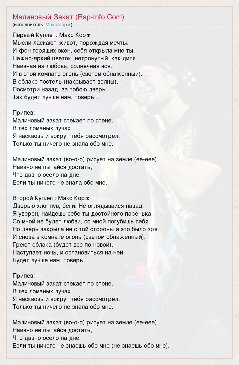 Первый Куплет: Макс Корж Мысли ласкают живот, порождая мечты. И фон горящих окон, себя открыла мне ты. Нежно-яркий цветок, нетронутый, как дитя. Наивная на любовь, солнечная вся. И в этой комнате огонь (светом обнаженный). В облаке постель (накрывает волны). Посмотри назад, за тобою дверь. Так будет лучше нам, поверь... Припев: Малиновый закат стекает по стене. В тех ломаных лучах Я насквозь и вокруг тебя рассмотрел. Только ты ничего не знала обо мне. Малиновый закат (во-о-о) рисует на земле (ее-еее). Наивно не пытайся достать, Что давно осело на дне. Если ты ничего не знала обо мне. Второй Куплет: Макс Корж Дверью хлопнув, беги. Не оглядывайся назад. Я уверен, найдешь себе ты достойного паренька. Со мной не будет любви, со мной погубишь себя. Но дверь закрыла не с той стороны и это было зря. И снова в комнате огонь (светом обнаженный). Греют облака (будет все по-новой). Наступает ночь, и остановиться на ней Будет лучше нам, поверь... Припев: Малиновый закат стекает по стене. В тех ломаных лучах Я насквозь и вокруг тебя рассмотрел. Только ты ничего не знала обо мне. Малиновый закат (во-о-о) рисует на земле (ее-еее). Наивно не пытайся достать, Что давно осело на дне. Если ты ничего не знаешь обо мне (не знаешь обо мне).