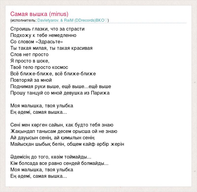 Строишь глазки, что за страсти Подхожу к тебе немедленно Со словом «Здрасьте» Ты такая милая, ты такая красивая Слов нет просто Я просто в шоке, Твоё тело просто космос Всё ближе-ближе, всё ближе-ближе Повторяй за мной Поднимая руки выше, ещё выше...ещё выше Прошу танцуй со мной девушка из Парижа Моя малышка, твоя улыбка Ең әдемі, самая вышка... Сені мен көрген сайын, как будто тебя знаю Жақындап танысам десем орысша ой не знаю Ай дауысын сенің, ай қимылын сенің Майысқан шыбық белін, общем кайф әрбір жерін Әдемісің до того, көзім тоймайды... Кім болсада все равно сендей болмайды... Моя малышка, твоя улыбка Ең әдемі, самая вышка...