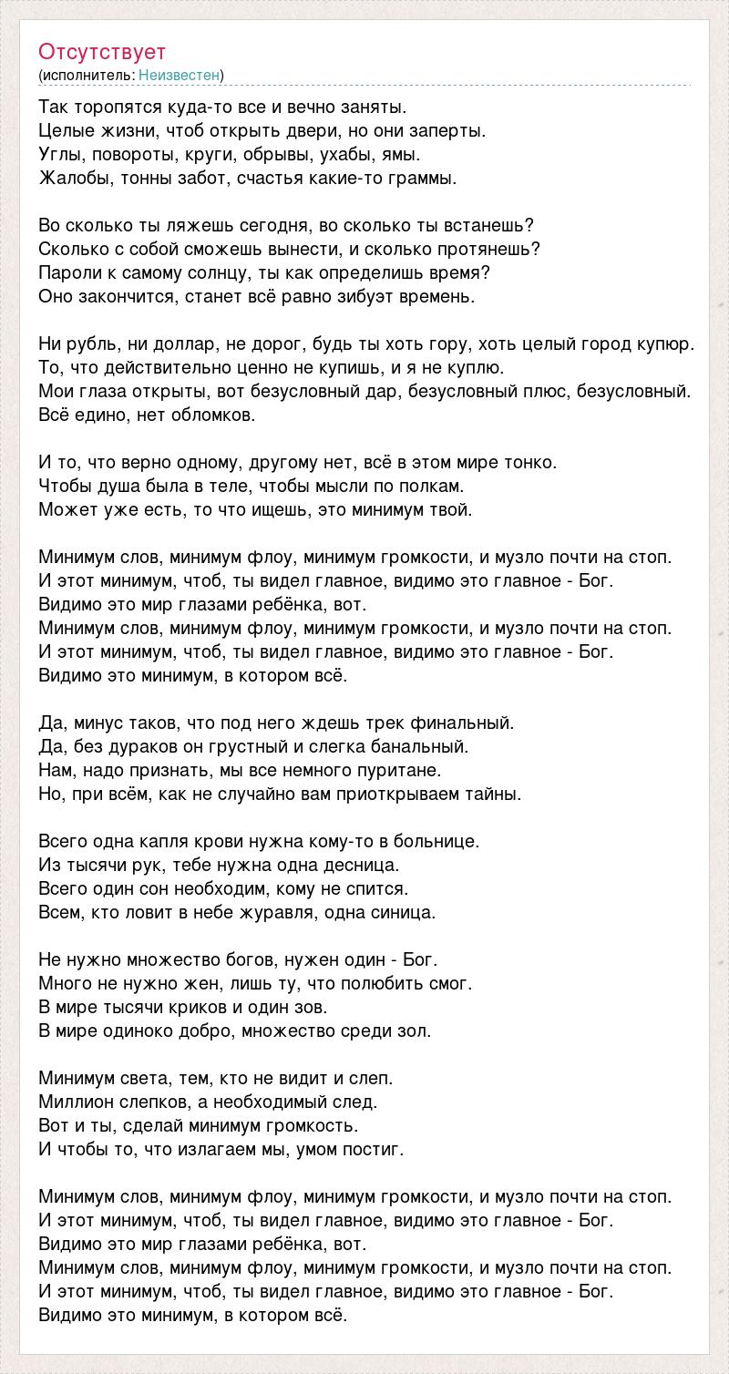 Так торопятся куда-то все и вечно заняты. Целые жизни, чтоб открыть двери, но они заперты. Углы, повороты, круги, обрывы, ухабы, ямы. Жалобы, тонны забот, счастья какие-то граммы. Во сколько ты ляжешь сегодня, во сколько ты встанешь? Сколько с собой сможешь вынести, и сколько протянешь? Пароли к самому солнцу, ты как определишь время? Оно закончится, станет всё равно зибуэт времень. Ни рубль, ни доллар, не дорог, будь ты хоть гору, хоть целый город купюр. То, что действительно ценно не купишь, и я не куплю. Мои глаза открыты, вот безусловный дар, безусловный плюс, безусловный. Всё едино, нет обломков. И то, что верно одному, другому нет, всё в этом мире тонко. Чтобы душа была в теле, чтобы мысли по полкам. Может уже есть, то что ищешь, это минимум твой. Минимум слов, минимум флоу, минимум громкости, и музло почти на стоп. И этот минимум, чтоб, ты видел главное, видимо это главное - Бог. Видимо это мир глазами ребёнка, вот. Минимум слов, минимум флоу, минимум громкости, и музло почти на стоп. И этот минимум, чтоб, ты видел главное, видимо это главное - Бог. Видимо это минимум, в котором всё. Да, минус таков, что под него ждешь трек финальный. Да, без дураков он грустный и слегка банальный. Нам, надо признать, мы все немного пуритане. Но, при всём, как не случайно вам приоткрываем тайны. Всего одна капля крови нужна кому-то в больнице. Из тысячи рук, тебе нужна одна десница. Всего один сон необходим, кому не спится. Всем, кто ловит в небе журавля, одна синица. Не нужно множество богов, нужен один - Бог. Много не нужно жен, лишь ту, что полюбить смог. В мире тысячи криков и один зов. В мире одиноко добро, множество среди зол. Минимум света, тем, кто не видит и слеп. Миллион слепков, а необходимый след. Вот и ты, сделай минимум громкость. И чтобы то, что излагаем мы, умом постиг. Минимум слов, минимум флоу, минимум громкости, и музло почти на стоп. И этот минимум, чтоб, ты видел главное, видимо это главное - Бог. Видимо это мир глазами ребёнка, вот. Минимум слов, минимум флоу, минимум громкости, и музло почти на стоп. И этот минимум, чтоб, ты видел главное, видимо это главное - Бог. Видимо это минимум, в котором всё.