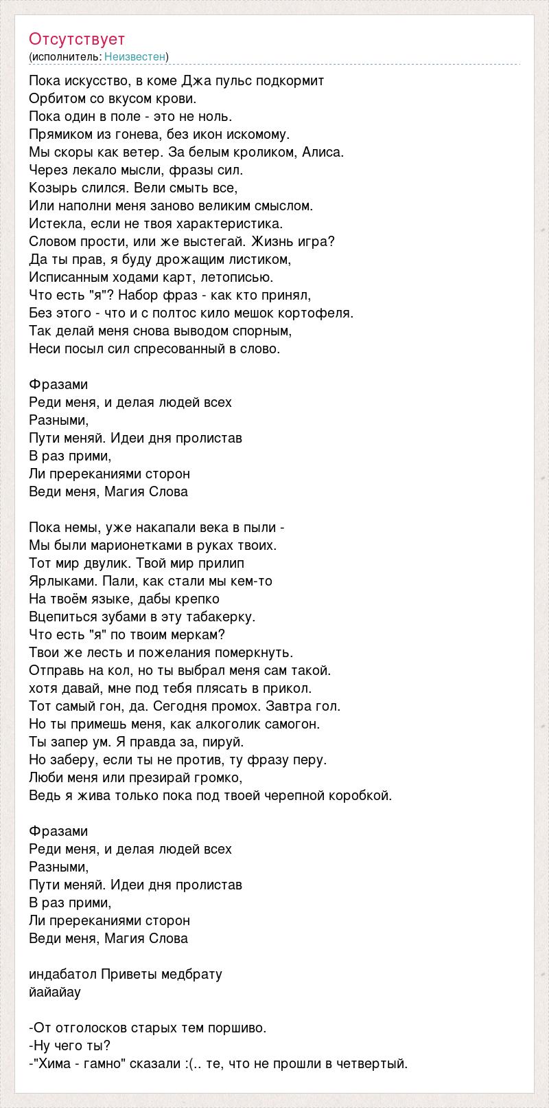 А как ты думаешь, о чем песня "Пока искусство, в коме Джа пульс подкормит" ?