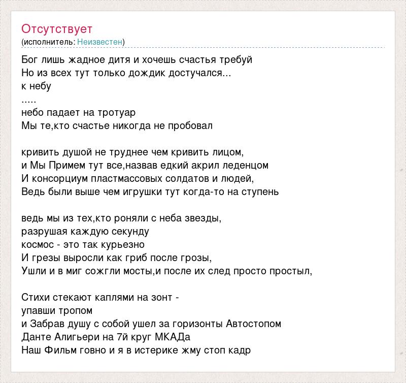 Бог лишь жадное дитя и хочешь счастья требуй Но из всех тут только дождик достучался... к небу ..... небо падает на тротуар Мы те,кто счастье никогда не пробовал кривить душой не труднее чем кривить лицом, и Мы Примем тут все,назвав едкий акрил леденцом И консорциум пластмассовых солдатов и людей, Ведь были выше чем игрушки тут когда-то на ступень ведь мы из тех,кто роняли с неба звезды, разрушая каждую секунду космос - это так курьезно И грезы выросли как гриб после грозы, Ушли и в миг сожгли мосты,и после их след просто простыл, Стихи стекают каплями на зонт - упавши тропом и Забрав душу с собой ушел за горизонты Автостопом Данте Алигьери на 7й круг МКАДа Наш Фильм говно и я в истерике жму стоп кадр