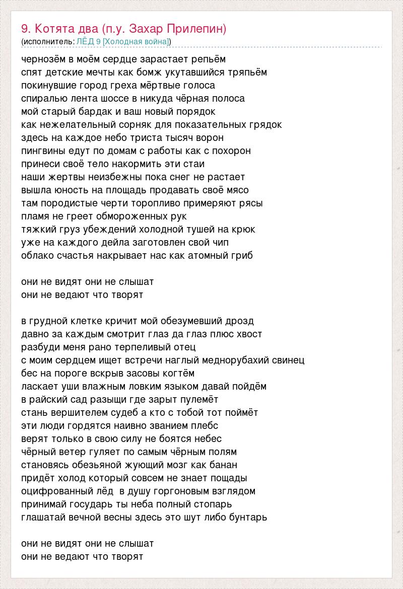 чернозём в моём сердце зарастает репьём спят детские мечты как бомж укутавшийся тряпьём покинувшие город греха мёртвые голоса спиралью лента шоссе в никуда чёрная полоса мой старый бардак и ваш новый порядок как нежелательный сорняк для показательных грядок здесь на каждое небо триста тысяч ворон пингвины едут по домам с работы как с похорон принеси своё тело накормить эти стаи наши жертвы неизбежны пока снег не растает вышла юность на площадь продавать своё мясо там породистые черти торопливо примеряют рясы пламя не греет обмороженных рук тяжкий груз убеждений холодной тушей на крюк уже на каждого дейла заготовлен свой чип облако счастья накрывает нас как атомный гриб они не видят они не слышат они не ведают что творят в грудной клетке кричит мой обезумевший дрозд давно за каждым смотрит глаз да глаз плюс хвост разбуди меня рано терпеливый отец с моим сердцем ищет встречи наглый меднорубахий свинец бес на пороге вскрыв засовы когтём ласкает уши влажным ловким языком давай пойдём в райский сад разыщи где зарыт пулемёт стань вершителем судеб а кто с тобой тот поймёт эти люди гордятся наивно званием плебс верят только в свою силу не боятся небес чёрный ветер гуляет по самым чёрным полям становясь обезьяной жующий мозг как банан придёт холод который совсем не знает пощады оцифрованный лёд в душу горгоновым взглядом принимай государь ты неба полный стопарь глашатай вечной весны здесь это шут либо бунтарь они не видят они не слышат они не ведают что творят
