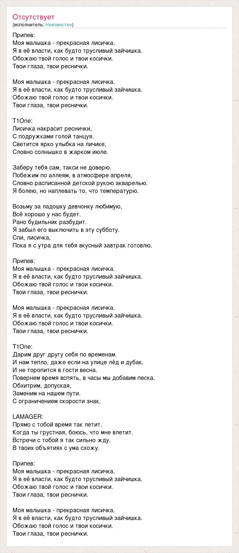 Припев: Моя малышка - прекрасная лисичка. Я в её власти, как будто трусливый зайчишка. Обожаю твой голос и твои косички. Твои глаза, твои реснички. Моя малышка - прекрасная лисичка. Я в её власти, как будто трусливый зайчишка. Обожаю твой голос и твои косички. Твои глаза, твои реснички. T1One: Лисичка накрасит реснички, С подружками голой танцуя. Светится ярко улыбка на личике, Словно солнышко в жарком июле. Заберу тебя сам, такси не доверю. Побежим по аллеям, в атмосфере апреля, Словно расписанной детской рукою акварелью. Я болею, но наплевать то, что температурю. Возьму за ладошку девчонку любимую, Всё хорошо у нас будет. Рано будильник разбудит. Я забыл его выключить в эту субботу. Спи, лисичка, Пока я с утра для тебя вкусный завтрак готовлю. Припев: Моя малышка - прекрасная лисичка. Я в её власти, как будто трусливый зайчишка. Обожаю твой голос и твои косички. Твои глаза, твои реснички. Моя малышка - прекрасная лисичка. Я в её власти, как будто трусливый зайчишка. Обожаю твой голос и твои косички. Твои глаза, твои реснички. T1One: Дарим друг другу себя по временам. И нам тепло, даже если на улице лёд и дубак. И не торопится в гости весна. Повернем время вспять, в часы мы добавим песка. Обхитрим, допуская, Заменим на нашем пути. С ограничением скорости знак. LAMAGER: Прямо с тобой время так летит. Когда ты грустная, боюсь, что мне влетит. Встречи с тобой я так сильно жду. В твоих объятиях с ума схожу. Припев: Моя малышка - прекрасная лисичка. Я в её власти, как будто трусливый зайчишка. Обожаю твой голос и твои косички. Твои глаза, твои реснички. Моя малышка - прекрасная лисичка. Я в её власти, как будто трусливый зайчишка. Обожаю твой голос и твои косички. Твои глаза, твои реснички.