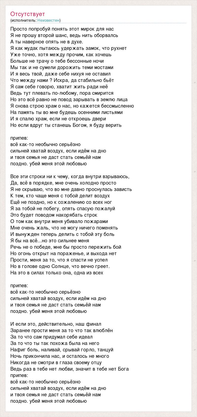 Просто попробуй понять этот мирок для нас Я не прошу второй шанс, ведь нить оборвалсь А ты наверное опять не в духе. Я как мудак пытаюсь удержать замок, что рухнет Уже точно, хотя между прочим, как хочешь Больше не трачу о тебе бессонные ночи Мы так и не сумели дорожить теми мостами И я весь твой, даже себе нихуя не оставил Что между нами ? Искра, да стабильно бьёт Я сам себе говорю, хватит жить ради неё Ведь тут плевать по-любому, пора смирится Но это всё равно не повод зарывать в землю лица Я снова строю храм о нас, но кажется бессмысленно На память ты во мне будешь осенними листьями И я спалю храм, если не откроешь двери Но если вдруг ты станешь Богом, я буду верить припев: всё как-то необычно серьёзно сильней хватай воздух, если идём на дно и твоя семья не даст стать семьёй нам поздно. убей меня этой любовью Все эти строки ни к чему, когда внутри взрываюсь, Да, всё в порядке, мне очень холодно просто Я не скрываю, что во мне давно проснулась зависть К тем, кто чаще меня с тобой делит воздух Ещё не поздно, но к сожалению со всех ног Я за тобой не побегу, опять спасую пожалуй Это будет поводом накорябать строк О том как внутри меня убивало пожарами Мне очень жаль, что не могу ничего поменять И вынужден теперь делить с тобой эту боль Я бы на всё...но это сильнее меня Речь не о победе, мне бы просто пережить бой Но огонь открыт на пораженье, и выхода нет Прости, меня за то, что я спасти не успел Но в голове одно Солнце, что вечно греет. На это в силах только она, одна из всех припев: всё как-то необычно серьёзно сильней хватай воздух, если идём на дно и твоя семья не даст стать семьёй нам поздно. убей меня этой любовью И если это, действительно, наш финал Заранее прости меня за то что так влюблён За то что сам придумал себе идеал За то что ты так похожа была на него Нафиг боль, наливай, срывай горло, танцуй Ночь прикончила нас, и осталось не много Никогда не смотри в глаза своему отцу Ведь раз в тебе нет любви, значит в тебе нет Бога припев: всё как-то необычно серьёзно сильней хватай воздух, если идём на дно и твоя семья не даст стать семьёй нам поздно. убей меня этой любовью