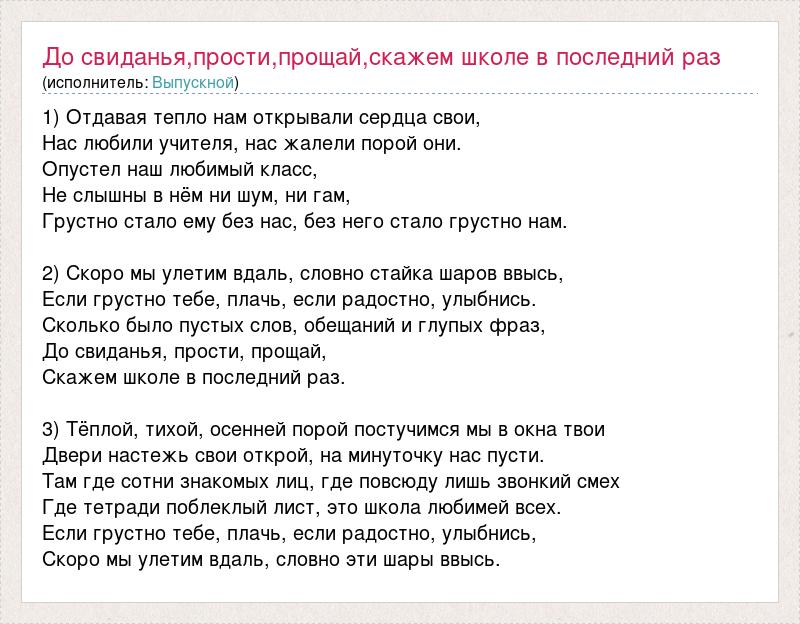 1) Отдавая тепло нам открывали сердца свои, Нас любили учителя, нас жалели порой они. Опустел наш любимый класс, Не слышны в нём ни шум, ни гам, Грустно стало ему без нас, без него стало грустно нам. 2) Скоро мы улетим вдаль, словно стайка шаров ввысь, Если грустно тебе, плачь, если радостно, улыбнись. Сколько было пустых слов, обещаний и глупых фраз, До свиданья, прости, прощай, Скажем школе в последний раз. 3) Тёплой, тихой, осенней порой постучимся мы в окна твои Двери настежь свои открой, на минуточку нас пусти. Там где сотни знакомых лиц, где повсюду лишь звонкий смех Где тетради поблеклый лист, это школа любимей всех. Если грустно тебе, плачь, если радостно, улыбнись, Скоро мы улетим вдаль, словно эти шары ввысь.