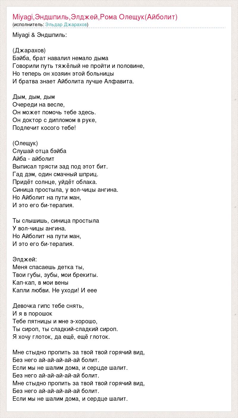 Miyagi & Эндшпиль: (Джарахов) Бэйба, брат навалил немало дыма Говорили путь тяжёлый не пройти и половине, Но теперь он хозяин этой больницы И братва знает Айболита лучше Алфавита. Дым, дым, дым Очереди на весле, Он может помочь тебе здесь. Он доктор с дипломом в руке, Подлечит косого тебе! (Олещук) Слушай отца бэйба Айба - айболит Выписал трясти зад под этот бит. Гад дэм, один смачный шприц. Придёт солнце, уйдёт облака. Синица простыла, у вол-чицы ангина. Но Айболит на пути ман, И это его би-терапия. Ты слышишь, синица простыла У вол-чицы ангина. Но Айболит на пути ман, И это его би-терапия. Элджей: Меня спасаешь детка ты, Твои губы, зубы, мои брекиты. Кап-кап, в мои вены Капли любви. Не уходи! И еее Девочка гипс тебе снять, И я в порошок Тебе пятницы и мне э-хорошо, Ты сироп, ты сладкий-сладкий сироп. Я хочу глоток, да ещё, ещё глоток. Мне стыдно пропить за твой твой горячий вид, Без него ай-ай-ай-ай-ай болит. Если мы не шалим дома, и серцде шалит. Без него ай-ай-ай-ай-ай болит. Мне стыдно пропить за твой твой горячий вид, Без него ай-ай-ай-ай-ай болит. Если мы не шалим дома, и сердце шалит.
