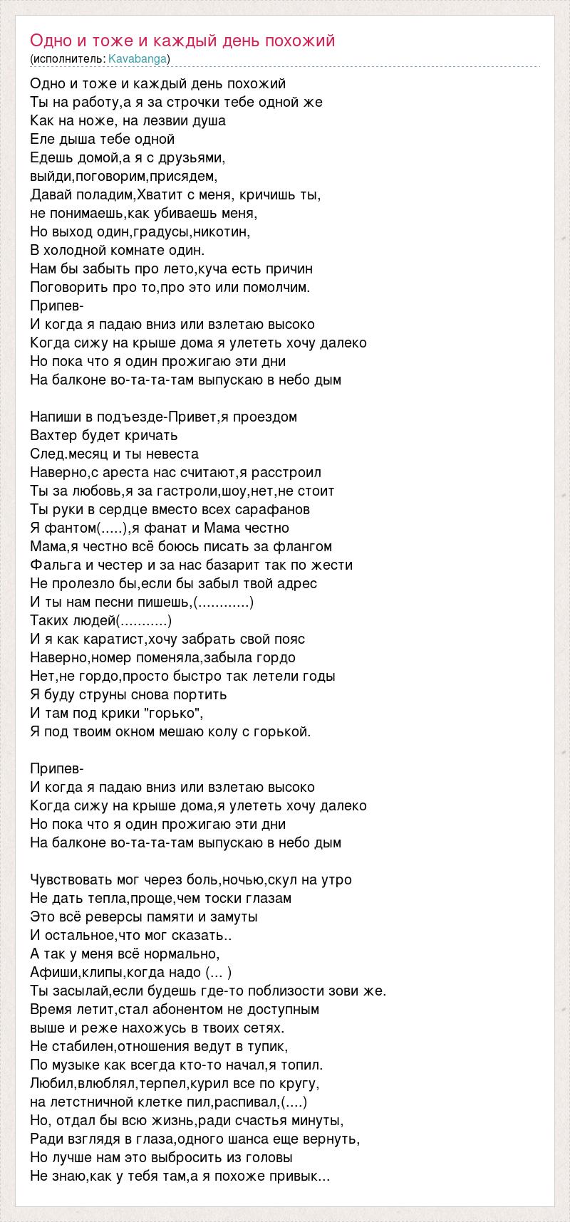 Одно и тоже и каждый день похожий Ты на работу,а я за строчки тебе одной же Как на ноже, на лезвии душа Еле дыша тебе одной Едешь домой,а я с друзьями, выйди,поговорим,присядем, Давай поладим,Хватит с меня, кричишь ты, не понимаешь,как убиваешь меня, Но выход один,градусы,никотин, В холодной комнате один. Нам бы забыть про лето,куча есть причин Поговорить про то,про это или помолчим. Припев- И когда я падаю вниз или взлетаю высоко Когда сижу на крыше дома я улететь хочу далеко Но пока что я один прожигаю эти дни На балконе во-та-та-там выпускаю в небо дым Напиши в подъезде-Привет,я проездом Вахтер будет кричать След.месяц и ты невеста Наверно,с ареста нас считают,я расстроил Ты за любовь,я за гастроли,шоу,нет,не стоит Ты руки в сердце вместо всех сарафанов Я фантом(.....),я фанат и Мама честно Мама,я честно всё боюсь писать за флангом Фальга и честер и за нас базарит так по жести Не пролезло бы,если бы забыл твой адрес И ты нам песни пишешь,(............) Таких людей(...........) И я как каратист,хочу забрать свой пояс Наверно,номер поменяла,забыла гордо Нет,не гордо,просто быстро так летели годы Я буду струны снова портить И там под крики "горько", Я под твоим окном мешаю колу с горькой. Припев- И когда я падаю вниз или взлетаю высоко Когда сижу на крыше дома,я улететь хочу далеко Но пока что я один прожигаю эти дни На балконе во-та-та-там выпускаю в небо дым Чувствовать мог через боль,ночью,скул на утро Не дать тепла,проще,чем тоски глазам Это всё реверсы памяти и замуты И остальное,что мог сказать.. А так у меня всё нормально, Афиши,клипы,когда надо (... ) Ты засылай,если будешь где-то поблизости зови же. Время летит,стал абонентом не доступным выше и реже нахожусь в твоих сетях. Не стабилен,отношения ведут в тупик, По музыке как всегда кто-то начал,я топил. Любил,влюблял,терпел,курил все по кругу, на летстничной клетке пил,распивал,(....) Но, отдал бы всю жизнь,ради счастья минуты, Ради взглядя в глаза,одного шанса еще вернуть, Но лучше нам это выбросить из головы Не знаю,как у тебя там,а я похоже привык...