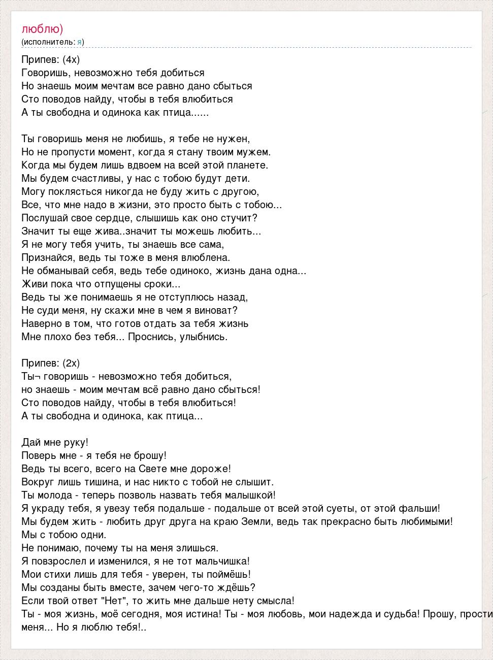 Припев: (4х) Говоришь, невозможно тебя добиться Но знаешь моим мечтам все равно дано сбыться Сто поводов найду, чтобы в тебя влюбиться А ты свободна и одинока как птица...... Ты говоришь меня не любишь, я тебе не нужен, Но не пропусти момент, когда я стану твоим мужем. Когда мы будем лишь вдвоем на всей этой планете. Мы будем счастливы, у нас с тобою будут дети. Могу поклясться никогда не буду жить с другою, Все, что мне надо в жизни, это просто быть с тобою... Послушай свое сердце, слышишь как оно стучит? Значит ты еще жива..значит ты можешь любить... Я не могу тебя учить, ты знаешь все сама, Признайся, ведь ты тоже в меня влюблена. Не обманывай себя, ведь тебе одиноко, жизнь дана одна... Живи пока что отпущены сроки... Ведь ты же понимаешь я не отступлюсь назад, Не суди меня, ну скажи мне в чем я виноват? Наверно в том, что готов отдать за тебя жизнь Мне плохо без тебя... Проснись, улыбнись. Припев: (2х) Ты¬ говоришь - невозможно тебя добиться, но знаешь - моим мечтам всё равно дано сбыться! Сто поводов найду, чтобы в тебя влюбиться! А ты свободна и одинока, как птица... Дай мне руку! Поверь мне - я тебя не брошу! Ведь ты всего, всего на Свете мне дороже! Вокруг лишь тишина, и нас никто с тобой не слышит. Ты молода - теперь позволь назвать тебя малышкой! Я украду тебя, я увезу тебя подальше - подальше от всей этой суеты, от этой фальши! Мы будем жить - любить друг друга на краю Земли, ведь так прекрасно быть любимыми! Мы с тобою одни. Не понимаю, почему ты на меня злишься. Я повзрослел и изменился, я не тот мальчишка! Мои стихи лишь для тебя - уверен, ты поймёшь! Мы созданы быть вместе, зачем чего-то ждёшь? Если твой ответ "Нет", то жить мне дальше нету смысла! Ты - моя жизнь, моё сегодня, моя истина! Ты - моя любовь, мои надежда и судьба! Прошу, прости меня... Но я люблю тебя!..