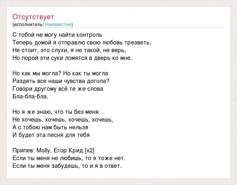 С тобой не могу найти контроль Теперь домой я отправлю свою любовь трезветь, Не стоит, это слухи, я не такой, не верь, Но порой эти суки ломятся в дверь ко мне. Но как мы могла? Но как ты могла Раздеть все наши чувства догола? Говори другому всё те же слова Бла-бла-бла. Но я же знаю, что ты без меня Не хочешь, хочешь, хочешь, хочешь, А с тобою нам быть нельзя И будет эта песня для тебя Припев: Molly, Егор Крид [x2] Если ты меня не любишь, то я тоже нет. Если ты меня забудешь, то и я в ответ.