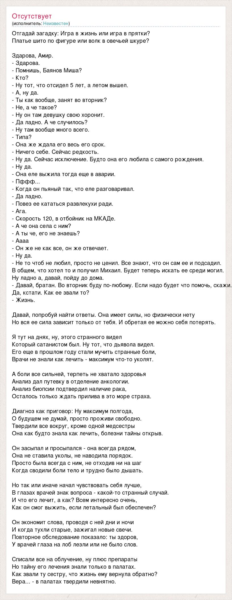 Отгадай загадку: Игра в жизнь или игра в прятки? Платье шито по фигуре или волк в овечьей шкуре? Здарова, Амир. - Здарова. - Помнишь, Баянов Миша? - Кто? - Ну тот, что отсидел 5 лет, а летом вышел. - А, ну да. - Ты как вообще, занят во вторник? - Не, а че такое? - Ну он там девушку свою хоронит. - Да ладно. А че случилось? - Ну там вообще много всего. - Типа? - Она же ждала его весь его срок. - Ничего себе. Сейчас редкость. - Ну да. Сейчас исключение. Будто она его любила с самого рождения. - Ну да. - Она еле выжила тогда еще в аварии. - Пффф... - Когда он пьяный так, что еле разговаривал. - Да ладно. - Повез ее кататься развлекухи ради. - Ага. - Скорость 120, в отбойник на МКАДе. - А че она села с ним? - А ты че, его не знаешь? - Аааа - Он же не как все, он же отвечает. - Ну да. - Не то чтоб не любил, просто не ценил. Все знают, что он сам ее и подсадил. В общем, что хотел то и получил Михаил. Будет теперь искать ее среди могил. Ну ладно а, давай, пойду до дома. - Давай, братан. Во вторник буду по-любому. Если надо будет что помочь, скажи. Да, кстати. Как ее звали то? - Жизнь. Давай, попробуй найти ответы. Она имеет силы, но физически нету Но вся ее сила зависит только от тебя. И обретая ее можно себя потерять. Я тут на днях, ну, этого странного видел Который сатанистом был. Ну тот, что дьявола видел. Его еще в прошлом году стали мучить странные боли, Врачи не знали как лечить - максимум что-то уколят. А боли все сильней, терпеть не хватало здоровья Анализ дал путевку в отделение анкологии. Анализ биопсии подтвердил наличие рака, Осталось только ждать прилива в это море страха. Диагноз как приговор: Ну максимум полгода, О будущем не думай, просто проживи свободно. Твердили все вокруг, кроме одной медсестры Она как будто знала как лечить, болезни тайны открыв. Он засыпал и просыпался - она всегда рядом, Она не ставила уколы, не наводила порядок. Просто была всегда с ним, не отходив ни на шаг Когда сводили боли тело и трудно было дышать. Но так или иначе начал чувствовать себя лучше, В глазах врачей знак вопроса - какой-то странный случай. И что его лечит, а как? Всем интересно очень, Как он смог выжить, если летальный был обеспечен? Он экономит слова, проводя с ней дни и ночи И когда тухли старые, зажигал новые свечи. Повторное обследование показало: ты здоров, У врачей глаза на лоб лезли или не было слов. Списали все на облучение, ну плюс препараты Но тайну его лечения знали только в палатах. Как звали ту сестру, что жизнь ему вернула обратно? Вера... - в палатах твердили невнятно.