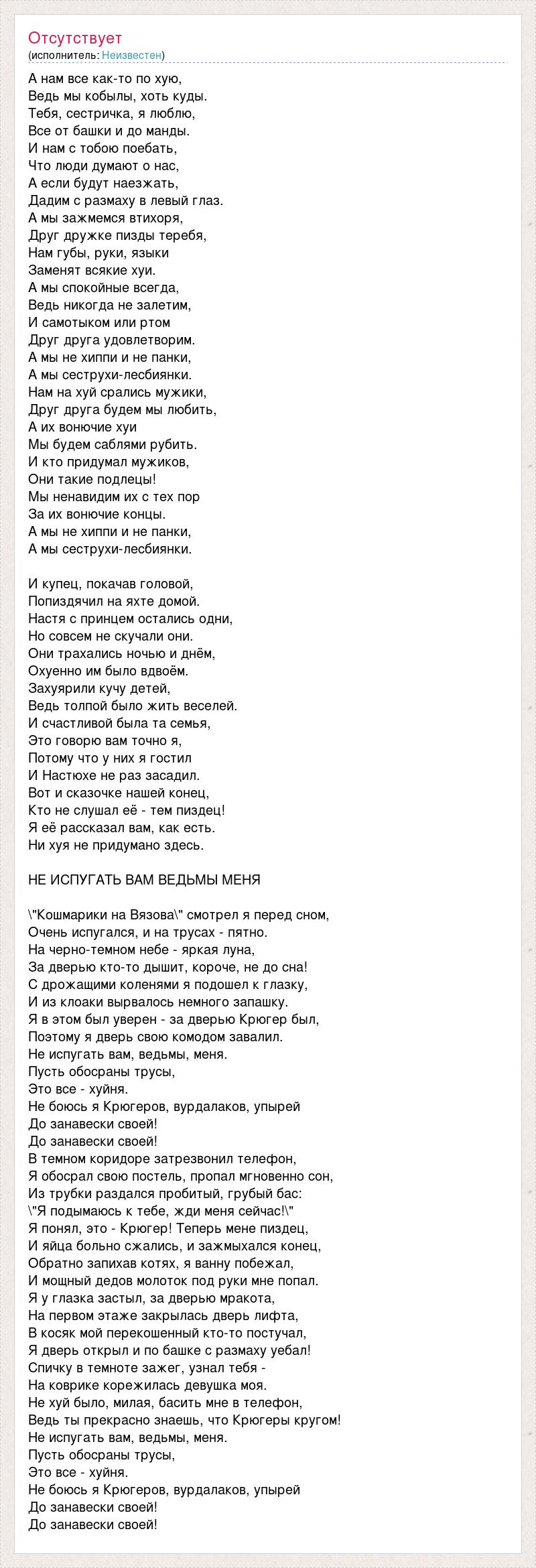 А нам все как-то по хую, Ведь мы кобылы, хоть куды. Тебя, сестричка, я люблю, Все от башки и до манды. И нам с тобою поебать, Что люди думают о нас, А если будут наезжать, Дадим с размаху в левый глаз. А мы зажмемся втихоря, Друг дружке пизды теребя, Нам губы, руки, языки Заменят всякие хуи. А мы спокойные всегда, Ведь никогда не залетим, И самотыком или ртом Друг друга удовлетворим. А мы не хиппи и не панки, А мы сеструхи-лесбиянки. Нам на хуй срались мужики, Друг друга будем мы любить, А их вонючие хуи Мы будем саблями рубить. И кто придумал мужиков, Они такие подлецы! Мы ненавидим их с тех пор За их вонючие концы. А мы не хиппи и не панки, А мы сеструхи-лесбиянки. И купец, покачав головой, Попиздячил на яхте домой. Настя с принцем остались одни, Но совсем не скучали они. Они трахались ночью и днём, Охуенно им было вдвоём. Захуярили кучу детей, Ведь толпой было жить веселей. И счастливой была та семья, Это говорю вам точно я, Потому что у них я гостил И Настюхе не раз засадил. Вот и сказочке нашей конец, Кто не слушал её - тем пиздец! Я её рассказал вам, как есть. Ни хуя не придумано здесь. НЕ ИСПУГАТЬ ВАМ ВЕДЬМЫ МЕНЯ \"Кошмарики на Вязова\" смотрел я перед сном, Очень испугался, и на трусах - пятно. На черно-темном небе - яркая луна, За дверью кто-то дышит, короче, не до сна! С дрожащими коленями я подошел к глазку, И из клоаки вырвалось немного запашку. Я в этом был уверен - за дверью Крюгер был, Поэтому я дверь свою комодом завалил. Не испугать вам, ведьмы, меня. Пусть обосраны трусы, Это все - хуйня. Не боюсь я Крюгеров, вурдалаков, упырей До занавески своей! До занавески своей! В темном коридоре затрезвонил телефон, Я обосрал свою постель, пропал мгновенно сон, Из трубки раздался пробитый, грубый бас: \"Я подымаюсь к тебе, жди меня сейчас!\" Я понял, это - Крюгер! Теперь мене пиздец, И яйца больно сжались, и зажмыхался конец, Обратно запихав котях, я ванну побежал, И мощный дедов молоток под руки мне попал. Я у глазка застыл, за дверью мракота, На первом этаже закрылась дверь лифта, В косяк мой перекошенный кто-то постучал, Я дверь открыл и по башке с размаху уебал! Спичку в темноте зажег, узнал тебя - На коврике корежилась девушка моя. Не хуй было, милая, басить мне в телефон, Ведь ты прекрасно знаешь, что Крюгеры кругом! Не испугать вам, ведьмы, меня. Пусть обосраны трусы, Это все - хуйня. Не боюсь я Крюгеров, вурдалаков, упырей До занавески своей! До занавески своей!