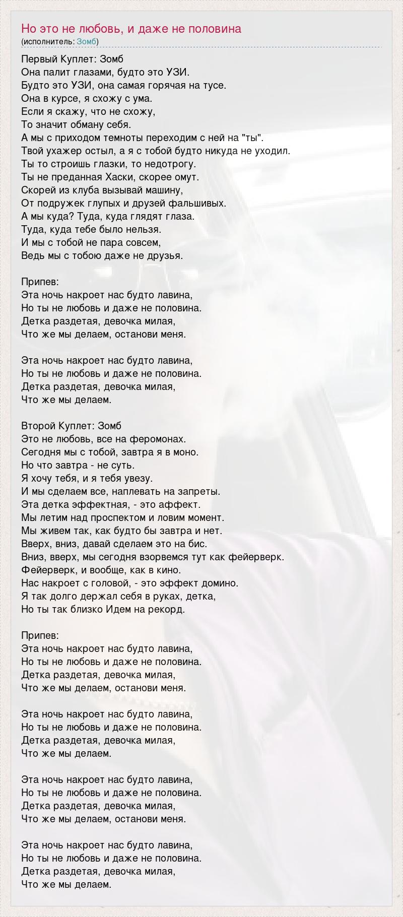 Первый Куплет: Зомб Она палит глазами, будто это УЗИ. Будто это УЗИ, она самая горячая на тусе. Она в курсе, я схожу с ума. Если я скажу, что не схожу, То значит обману себя. А мы с приходом темноты переходим с ней на "ты". Твой ухажер остыл, а я с тобой будто никуда не уходил. Ты то строишь глазки, то недотрогу. Ты не преданная Хаски, скорее омут. Скорей из клуба вызывай машину, От подружек глупых и друзей фальшивых. А мы куда? Туда, куда глядят глаза. Туда, куда тебе было нельзя. И мы с тобой не пара совсем, Ведь мы с тобою даже не друзья. Припев: Эта ночь накроет нас будто лавина, Но ты не любовь и даже не половина. Детка раздетая, девочка милая, Что же мы делаем, останови меня. Эта ночь накроет нас будто лавина, Но ты не любовь и даже не половина. Детка раздетая, девочка милая, Что же мы делаем. Второй Куплет: Зомб Это не любовь, все на феромонах. Сегодня мы с тобой, завтра я в моно. Но что завтра - не суть. Я хочу тебя, и я тебя увезу. И мы сделаем все, наплевать на запреты. Эта детка эффектная, - это аффект. Мы летим над проспектом и ловим момент. Мы живем так, как будто бы завтра и нет. Вверх, вниз, давай сделаем это на бис. Вниз, вверх, мы сегодня взорвемся тут как фейерверк. Фейерверк, и вообще, как в кино. Нас накроет с головой, - это эффект домино. Я так долго держал себя в руках, детка, Но ты так близко Идем на рекорд. Припев: Эта ночь накроет нас будто лавина, Но ты не любовь и даже не половина. Детка раздетая, девочка милая, Что же мы делаем, останови меня. Эта ночь накроет нас будто лавина, Но ты не любовь и даже не половина. Детка раздетая, девочка милая, Что же мы делаем. Эта ночь накроет нас будто лавина, Но ты не любовь и даже не половина. Детка раздетая, девочка милая, Что же мы делаем, останови меня. Эта ночь накроет нас будто лавина, Но ты не любовь и даже не половина. Детка раздетая, девочка милая, Что же мы делаем.