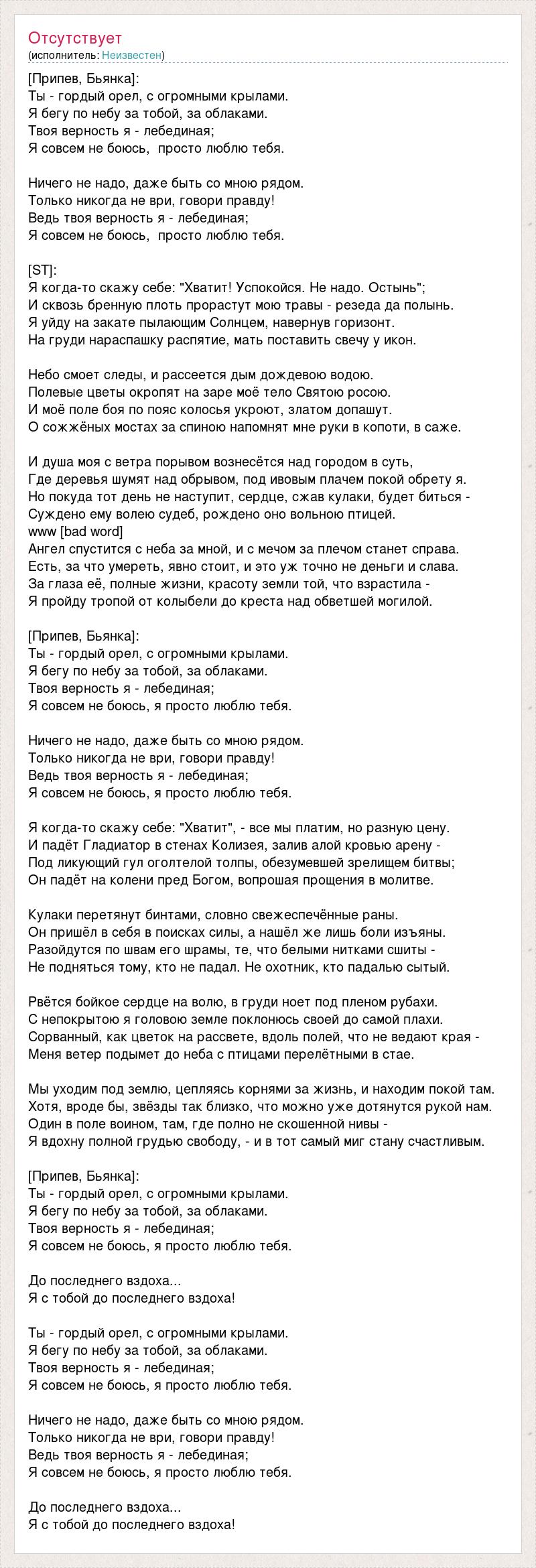 [Припев, Бьянка]: Ты - гордый орел, с огромными крылами. Я бегу по небу за тобой, за облаками. Твоя верность я - лебединая; Я совсем не боюсь, просто люблю тебя. Ничего не надо, даже быть со мною рядом. Только никогда не ври, говори правду! Ведь твоя верность я - лебединая; Я совсем не боюсь, просто люблю тебя. [ST]: Я когда-то скажу себе: "Хватит! Успокойся. Не надо. Остынь"; И сквозь бренную плоть прорастут мою травы - резеда да полынь. Я уйду на закате пылающим Солнцем, навернув горизонт. На груди нараспашку распятие, мать поставить свечу у икон. Небо смоет следы, и рассеется дым дождевою водою. Полевые цветы окропят на заре моё тело Святою росою. И моё поле боя по пояс колосья укроют, златом допашут. О сожжёных мостах за спиною напомнят мне руки в копоти, в саже. И душа моя с ветра порывом вознесётся над городом в суть, Где деревья шумят над обрывом, под ивовым плачем покой обрету я. Но покуда тот день не наступит, сердце, сжав кулаки, будет биться - Суждено ему волею судеб, рождено оно вольною птицей. www [bad word] Ангел спустится с неба за мной, и с мечом за плечом станет справа. Есть, за что умереть, явно стоит, и это уж точно не деньги и слава. За глаза её, полные жизни, красоту земли той, что взрастила - Я пройду тропой от колыбели до креста над обветшей могилой. [Припев, Бьянка]: Ты - гордый орел, с огромными крылами. Я бегу по небу за тобой, за облаками. Твоя верность я - лебединая; Я совсем не боюсь, я просто люблю тебя. Ничего не надо, даже быть со мною рядом. Только никогда не ври, говори правду! Ведь твоя верность я - лебединая; Я совсем не боюсь, я просто люблю тебя. Я когда-то скажу себе: "Хватит", - все мы платим, но разную цену. И падёт Гладиатор в стенах Колизея, залив алой кровью арену - Под ликующий гул оголтелой толпы, обезумевшей зрелищем битвы; Он падёт на колени пред Богом, вопрошая прощения в молитве. Кулаки перетянут бинтами, словно свежеспечённые раны. Он пришёл в себя в поисках силы, а нашёл же лишь боли изъяны. Разойдутся по швам его шрамы, те, что белыми нитками сшиты - Не подняться тому, кто не падал. Не охотник, кто падалью сытый. Рвётся бойкое сердце на волю, в груди ноет под пленом рубахи. С непокрытою я головою земле поклонюсь своей до самой плахи. Сорванный, как цветок на рассвете, вдоль полей, что не ведают края - Меня ветер подымет до неба с птицами перелётными в стае. Мы уходим под землю, цепляясь корнями за жизнь, и находим покой там. Хотя, вроде бы, звёзды так близко, что можно уже дотянутся рукой нам. Один в поле воином, там, где полно не скошенной нивы - Я вдохну полной грудью свободу, - и в тот самый миг стану счастливым. [Припев, Бьянка]: Ты - гордый орел, с огромными крылами. Я бегу по небу за тобой, за облаками. Твоя верность я - лебединая; Я совсем не боюсь, я просто люблю тебя. До последнего вздоха... Я с тобой до последнего вздоха! Ты - гордый орел, с огромными крылами. Я бегу по небу за тобой, за облаками. Твоя верность я - лебединая; Я совсем не боюсь, я просто люблю тебя. Ничего не надо, даже быть со мною рядом. Только никогда не ври, говори правду! Ведь твоя верность я - лебединая; Я совсем не боюсь, я просто люблю тебя. До последнего вздоха... Я с тобой до последнего вздоха!