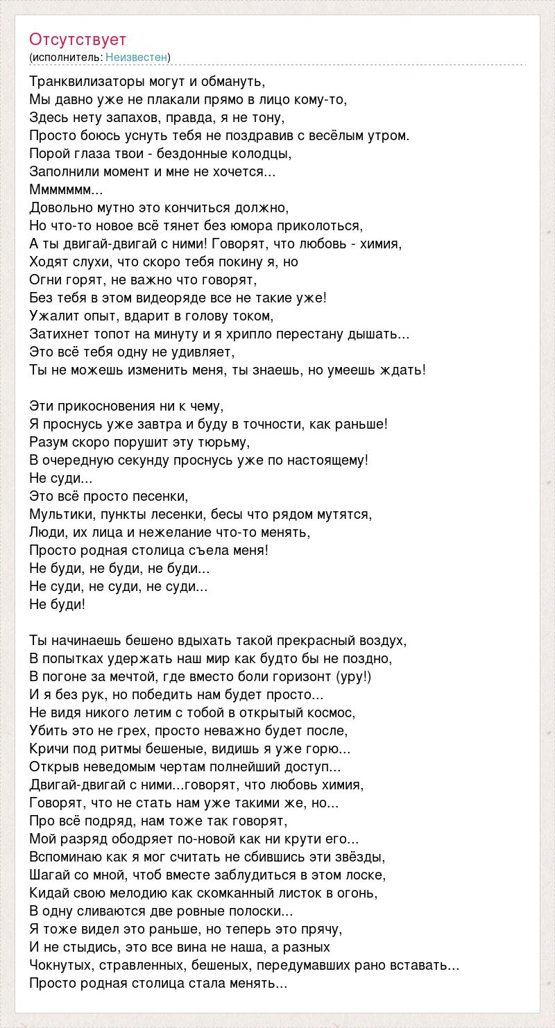 Транквилизаторы могут и обмануть, Мы давно уже не плакали прямо в лицо кому-то, Здесь нету запахов, правда, я не тону, Просто боюсь уснуть тебя не поздравив с весёлым утром. Порой глаза твои - бездонные колодцы, Заполнили момент и мне не хочется... Ммммммм... Довольно мутно это кончиться должно, Но что-то новое всё тянет без юмора приколоться, А ты двигай-двигай с ними! Говорят, что любовь - химия, Ходят слухи, что скоро тебя покину я, но Огни горят, не важно что говорят, Без тебя в этом видеоряде все не такие уже! Ужалит опыт, вдарит в голову током, Затихнет топот на минуту и я хрипло перестану дышать... Это всё тебя одну не удивляет, Ты не можешь изменить меня, ты знаешь, но умеешь ждать! Эти прикосновения ни к чему, Я проснусь уже завтра и буду в точности, как раньше! Разум скоро порушит эту тюрьму, В очередную секунду проснусь уже по настоящему! Не суди... Это всё просто песенки, Мультики, пункты лесенки, бесы что рядом мутятся, Люди, их лица и нежелание что-то менять, Просто родная столица съела меня! Не буди, не буди, не буди... Не суди, не суди, не суди... Не буди! Ты начинаешь бешено вдыхать такой прекрасный воздух, В попытках удержать наш мир как будто бы не поздно, В погоне за мечтой, где вместо боли горизонт (уру!) И я без рук, но победить нам будет просто... Не видя никого летим с тобой в открытый космос, Убить это не грех, просто неважно будет после, Кричи под ритмы бешеные, видишь я уже горю... Открыв неведомым чертам полнейший доступ... Двигай-двигай с ними...говорят, что любовь химия, Говорят, что не стать нам уже такими же, но... Про всё подряд, нам тоже так говорят, Мой разряд ободряет по-новой как ни крути его... Вспоминаю как я мог считать не сбившись эти звёзды, Шагай со мной, чтоб вместе заблудиться в этом лоске, Кидай свою мелодию как скомканный листок в огонь, В одну сливаются две ровные полоски... Я тоже видел это раньше, но теперь это прячу, И не стыдись, это все вина не наша, а разных Чокнутых, стравленных, бешеных, передумавших рано вставать... Просто родная столица стала менять...