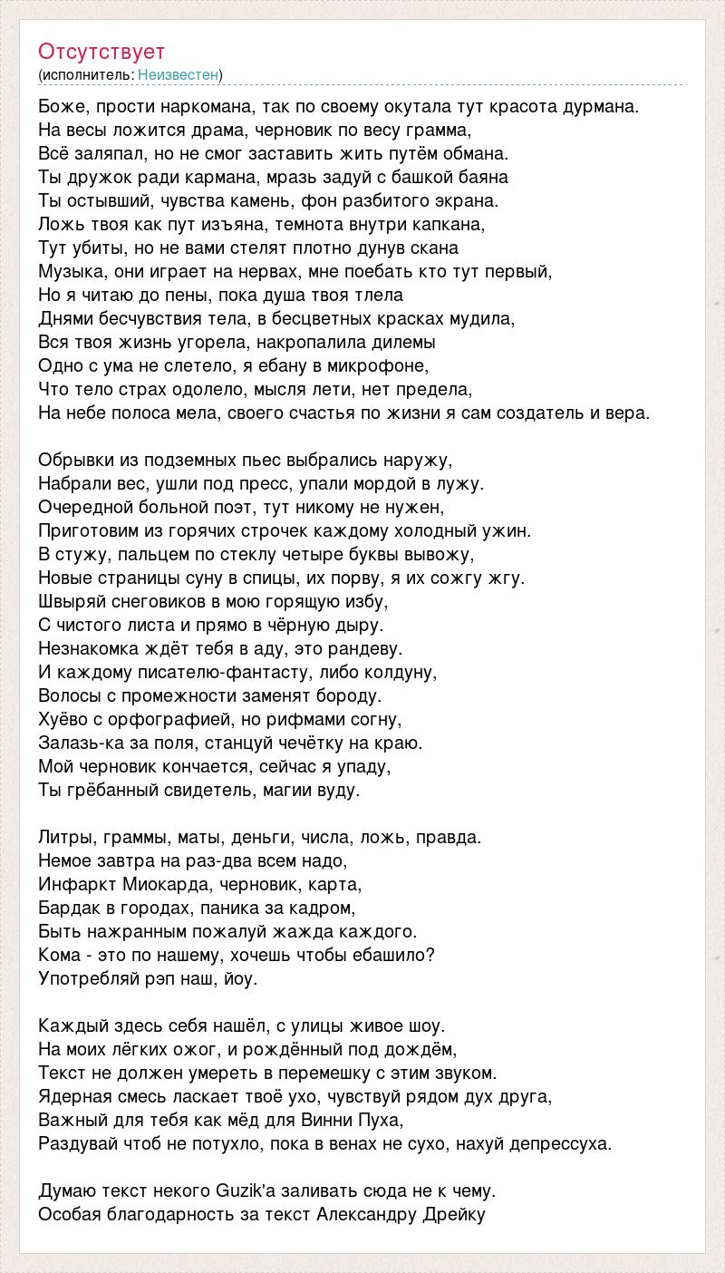 Боже, прости наркомана, так по своему окутала тут красота дурмана. На весы ложится драма, черновик по весу грамма, Всё заляпал, но не смог заставить жить путём обмана. Ты дружок ради кармана, мразь задуй с башкой баяна Ты остывший, чувства камень, фон разбитого экрана. Ложь твоя как пут изъяна, темнота внутри капкана, Тут убиты, но не вами стелят плотно дунув скана Музыка, они играет на нервах, мне поебать кто тут первый, Но я читаю до пены, пока душа твоя тлела Днями бесчувствия тела, в бесцветных красках мудила, Вся твоя жизнь угорела, накропалила дилемы Одно с ума не слетело, я ебану в микрофоне, Что тело страх одолело, мысля лети, нет предела, На небе полоса мела, своего счастья по жизни я сам создатель и вера. Обрывки из подземных пьес выбрались наружу, Набрали вес, ушли под пресс, упали мордой в лужу. Очередной больной поэт, тут никому не нужен, Приготовим из горячих строчек каждому холодный ужин. В стужу, пальцем по стеклу четыре буквы вывожу, Новые страницы суну в спицы, их порву, я их сожгу жгу. Швыряй снеговиков в мою горящую избу, С чистого листа и прямо в чёрную дыру. Незнакомка ждёт тебя в аду, это рандеву. И каждому писателю-фантасту, либо колдуну, Волосы с промежности заменят бороду. Хуёво с орфографией, но рифмами согну, Залазь-ка за поля, станцуй чечётку на краю. Мой черновик кончается, сейчас я упаду, Ты грёбанный свидетель, магии вуду. Литры, граммы, маты, деньги, числа, ложь, правда. Немое завтра на раз-два всем надо, Инфаркт Миокарда, черновик, карта, Бардак в городах, паника за кадром, Быть нажранным пожалуй жажда каждого. Кома - это по нашему, хочешь чтобы ебашило? Употребляй рэп наш, йоу. Каждый здесь себя нашёл, с улицы живое шоу. На моих лёгких ожог, и рождённый под дождём, Текст не должен умереть в перемешку с этим звуком. Ядерная смесь ласкает твоё ухо, чувствуй рядом дух друга, Важный для тебя как мёд для Винни Пуха, Раздувай чтоб не потухло, пока в венах не сухо, нахуй депрессуха. Думаю текст некого Guzik'а заливать сюда не к чему. Особая благодарность за текст Александру Дрейку