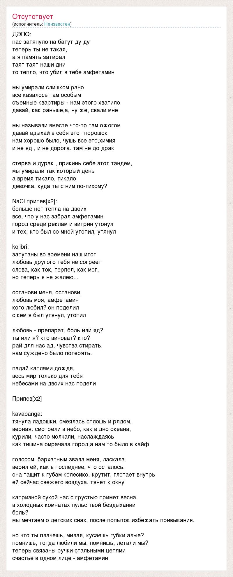 ДЭПО: нас затянуло на батут ду-ду теперь ты не такая, а я память затирал таят таят наши дни то тепло, что убил в тебе амфетамин мы умирали слишком рано все казалось там особым съемные квартиры - нам этого хватило давай, как раньше,а, ну же, свали мне мы называли вместе что-то там ожогом давай вдыхай в себя этот порошок нам хорошо было, чушь все это,химия и не яд , и не дорога. там не до драк стерва и дурак , прикинь себе этот тандем, мы умирали так который день а время тикало, тикало девочка, куда ты с ним по-тихому? NaCl припев[х2]: больше нет тепла на двоих все, что у нас забрал амфетамин город среди реклам и витрин утонул и тех, кто был со мной утопил, утянул kolibri: запутаны во времени наш итог любовь другого тебя не согреет слова, как ток, терпел, как мог, но теперь я не жалею... останови меня, останови, любовь моя, амфетамин кого любил? он поделил с кем я был утянул, утопил любовь - препарат, боль или яд? ты или я? кто виноват? кто? рай для нас ад, чувства стирать, нам суждено было потерять. падай каплями дождя, весь мир только для тебя небесами на двоих нас подели Припев[х2] kavabanga: тянула ладошки, смеялась сплошь и рядом, верная. смотрели в небо, как в дно океана, курили, часто молчали, наслаждаясь как тишина омрачала город,а нам то было в кайф голосом, бархатным звала меня, ласкала. верил ей, как в последнее, что осталось. она тащит к губам колесико, крутит, глотает внутрь ей сейчас свежего воздуха. тянет к окну капризной сукой нас с грустью примет весна в холодных комнатах пульс твой бездыхании боль? мы мечтаем о детских снах, после попыток избежать привыкания. но что ты плачешь, милая, кусаешь губки алые? помнишь, тогда любили мы, помнишь, летали мы? теперь связаны ручки стальными цепями счастье в одном лице - амфетамин
