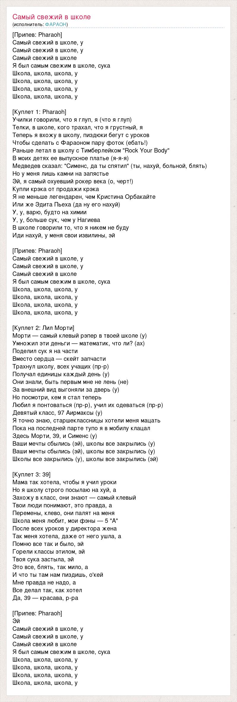 [Припев: Pharaoh] Самый свежий в школе, у Самый свежий в школе, у Самый свежий в школе Я был самым свежим в школе, сука Школа, школа, школа, у Школа, школа, школа, у Школа, школа, школа, у Школа, школа, школа, у [Куплет 1: Pharaoh] Училки говорили, что я глуп, я (что я глуп) Телки, в школе, кого трахал, что я грустный, я Теперь я вхожу в школу, пиздюки бегут с уроков Чтобы сделать с Фараоном пару фоток (ебать!) Раньше летал в школу с Тимберлейком "Rock Your Body" В моих детях ее выпускное платье (я-я-я) Медведев сказал: "Сименс, да ты спятил" (ты, нахуй, больной, блять) Но у меня лишь камни на запястье Эй, я самый охуевший рокер века (о, черт!) Купли крэка от продажи крэка Я не меньше легендарен, чем Кристина Орбакайте Или же Эдита Пьеха (да ну его нахуй) У, у, варю, будто на химии У, у, больше сук, чем у Нагиева В школе говорили то, что я никем не буду Иди нахуй, у меня свои извилины, эй [Припев: Pharaoh] Самый свежий в школе, у Самый свежий в школе, у Самый свежий в школе Я был самым свежим в школе, сука Школа, школа, школа, у Школа, школа, школа, у Школа, школа, школа, у Школа, школа, школа, у [Куплет 2: Лил Морти] Морти — самый клевый рэпер в твоей школе (у) Умножил эти деньги — математик, что ли? (ах) Поделил сук я на части Вместо сердца — скейт запчасти Трахнул школу, всех учащих (пр-р) Получал единицы каждый день (у) Они знали, быть первым мне не лень (не) За внешний вид выгоняли за дверь (у) Но посмотри, кем я стал теперь Любил я понтоваться (пр-р), учил их одеваться (пр-р) Девятый класс, 97 Аирмаксы (у) Я точно знаю, старшеклассницы хотели меня мацать Пока на последней парте тупо я в мобилу клацал Здесь Морти, 39, и Сименс (у) Ваши мечты сбылись (эй), школы все закрылись (у) Ваши мечты сбылись (эй), школы все закрылись (у) Школы все закрылись (у), школы все закрылись (эй) [Куплет 3: 39] Мама так хотела, чтобы я учил уроки Но я школу строго посылаю на хуй, а Захожу в класс, они знают — самый клевый Твои люди понимают, это правда, а Перемены, клево, они палят на меня Школа меня любит, мои фэны — 5 "А" После всех уроков у директора жена Так меня хотела, даже от него ушла, а Помню все так и было, эй Горели классы этилом, эй Твоя сука застыла, эй Это все, блять, так мило, а И что ты там нам пиздишь, о'кей Мне правда не надо, а Все делал так, как хотел Да, 39 — красава, р-ра [Припев: Pharaoh] Эй Самый свежий в школе, у Самый свежий в школе, у Самый свежий в школе Я был самым свежим в школе, сука Школа, школа, школа, у Школа, школа, школа, у Школа, школа, школа, у Школа, школа, школа, у