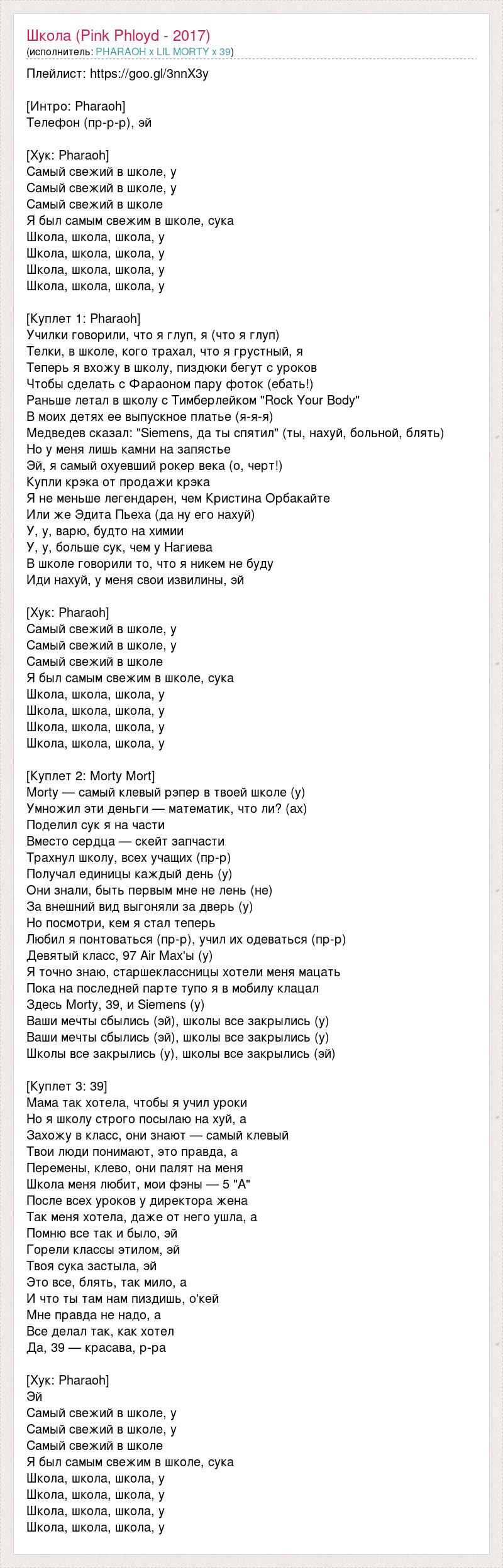 Плейлист: https://goo.gl/3nnX3y [Интро: Pharaoh] Телефон (пр-р-р), эй [Хук: Pharaoh] Самый свежий в школе, у Самый свежий в школе, у Самый свежий в школе Я был самым свежим в школе, сука Школа, школа, школа, у Школа, школа, школа, у Школа, школа, школа, у Школа, школа, школа, у [Куплет 1: Pharaoh] Училки говорили, что я глуп, я (что я глуп) Телки, в школе, кого трахал, что я грустный, я Теперь я вхожу в школу, пиздюки бегут с уроков Чтобы сделать с Фараоном пару фоток (ебать!) Раньше летал в школу с Тимберлейком "Rock Your Body" В моих детях ее выпускное платье (я-я-я) Медведев сказал: "Siemens, да ты спятил" (ты, нахуй, больной, блять) Но у меня лишь камни на запястье Эй, я самый охуевший рокер века (о, черт!) Купли крэка от продажи крэка Я не меньше легендарен, чем Кристина Орбакайте Или же Эдита Пьеха (да ну его нахуй) У, у, варю, будто на химии У, у, больше сук, чем у Нагиева В школе говорили то, что я никем не буду Иди нахуй, у меня свои извилины, эй [Хук: Pharaoh] Самый свежий в школе, у Самый свежий в школе, у Самый свежий в школе Я был самым свежим в школе, сука Школа, школа, школа, у Школа, школа, школа, у Школа, школа, школа, у Школа, школа, школа, у [Куплет 2: Morty Mort] Morty — самый клевый рэпер в твоей школе (у) Умножил эти деньги — математик, что ли? (ах) Поделил сук я на части Вместо сердца — скейт запчасти Трахнул школу, всех учащих (пр-р) Получал единицы каждый день (у) Они знали, быть первым мне не лень (не) За внешний вид выгоняли за дверь (у) Но посмотри, кем я стал теперь Любил я понтоваться (пр-р), учил их одеваться (пр-р) Девятый класс, 97 Air Max'ы (у) Я точно знаю, старшеклассницы хотели меня мацать Пока на последней парте тупо я в мобилу клацал Здесь Morty, 39, и Siemens (у) Ваши мечты сбылись (эй), школы все закрылись (у) Ваши мечты сбылись (эй), школы все закрылись (у) Школы все закрылись (у), школы все закрылись (эй) [Куплет 3: 39] Мама так хотела, чтобы я учил уроки Но я школу строго посылаю на хуй, а Захожу в класс, они знают — самый клевый Твои люди понимают, это правда, а Перемены, клево, они палят на меня Школа меня любит, мои фэны — 5 "А" После всех уроков у директора жена Так меня хотела, даже от него ушла, а Помню все так и было, эй Горели классы этилом, эй Твоя сука застыла, эй Это все, блять, так мило, а И что ты там нам пиздишь, о'кей Мне правда не надо, а Все делал так, как хотел Да, 39 — красава, р-ра [Хук: Pharaoh] Эй Самый свежий в школе, у Самый свежий в школе, у Самый свежий в школе Я был самым свежим в школе, сука Школа, школа, школа, у Школа, школа, школа, у Школа, школа, школа, у Школа, школа, школа, у