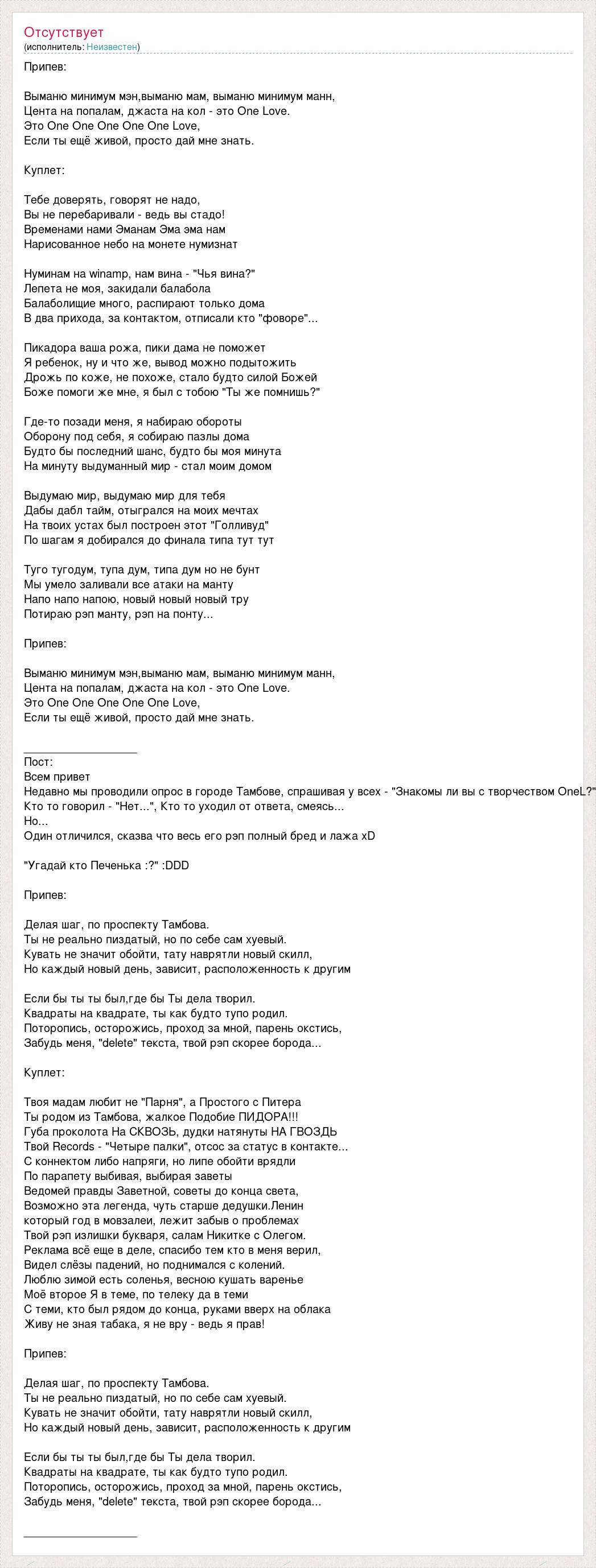 Припев: Выманю минимум мэн,выманю мам, выманю минимум манн, Цента на попалам, джаста на кол - это One Love. Это One One One One One Love, Если ты ещё живой, просто дай мне знать. Куплет: Тебе доверять, говорят не надо, Вы не перебаривали - ведь вы стадо! Временами нами Эманам Эма эма нам Нарисованное небо на монете нумизнат Нуминам на winamp, нам вина - "Чья вина?" Лепета не моя, закидали балабола Балаболищие много, распирают только дома В два прихода, за контактом, отписали кто "фоворе"... Пикадора ваша рожа, пики дама не поможет Я ребенок, ну и что же, вывод можно подытожить Дрожь по коже, не похоже, стало будто силой Божей Боже помоги же мне, я был с тобою "Ты же помнишь?" Где-то позади меня, я набираю обороты Оборону под себя, я собираю пазлы дома Будто бы последний шанс, будто бы моя минута На минуту выдуманный мир - стал моим домом Выдумаю мир, выдумаю мир для тебя Дабы дабл тайм, отыгрался на моих мечтах На твоих устах был построен этот "Голливуд" По шагам я добирался до финала типа тут тут Туго тугодум, тупа дум, типа дум но не бунт Мы умело заливали все атаки на манту Напо напо напою, новый новый новый тру Потираю рэп манту, рэп на понту... Припев: Выманю минимум мэн,выманю мам, выманю минимум манн, Цента на попалам, джаста на кол - это One Love. Это One One One One One Love, Если ты ещё живой, просто дай мне знать. __________________ Пост: Всем привет Недавно мы проводили опрос в городе Тамбове, спрашивая у всех - "Знакомы ли вы с творчеством OneL?" Кто то говорил - "Нет...", Кто то уходил от ответа, смеясь... Но... Один отличился, сказва что весь его рэп полный бред и лажа xD "Угадай кто Печенька :?" :DDD Припев: Делая шаг, по проспекту Тамбова. Ты не реально пиздатый, но по себе сам хуевый. Кувать не значит обойти, тату наврятли новый скилл, Но каждый новый день, зависит, расположенность к другим Если бы ты ты был,где бы Ты дела творил. Квадраты на квадрате, ты как будто тупо родил. Поторопись, осторожись, проход за мной, парень окстись, Забудь меня, "delete" текста, твой рэп скорее борода... Куплет: Твоя мадам любит не "Парня", а Простого с Питера Ты родом из Тамбова, жалкое Подобие ПИДОРА!!! Губа проколота На СКВОЗЬ, дудки натянуты НА ГВОЗДЬ Твой Records - "Четыре палки", отсос за статус в контакте... С коннектом либо напряги, но липе обойти врядли По парапету выбивая, выбирая заветы Ведомей правды Заветной, советы до конца света, Возможно эта легенда, чуть старше дедушки.Ленин который год в мовзалеи, лежит забыв о проблемах Твой рэп излишки букваря, салам Никитке с Олегом. Реклама всё еще в деле, спасибо тем кто в меня верил, Видел слёзы падений, но поднимался с колений. Люблю зимой есть соленья, весною кушать варенье Моё второе Я в теме, по телеку да в теми С теми, кто был рядом до конца, руками вверх на облака Живу не зная табака, я не вру - ведь я прав! Припев: Делая шаг, по проспекту Тамбова. Ты не реально пиздатый, но по себе сам хуевый. Кувать не значит обойти, тату наврятли новый скилл, Но каждый новый день, зависит, расположенность к другим Если бы ты ты был,где бы Ты дела творил. Квадраты на квадрате, ты как будто тупо родил. Поторопись, осторожись, проход за мной, парень окстись, Забудь меня, "delete" текста, твой рэп скорее борода... __________________