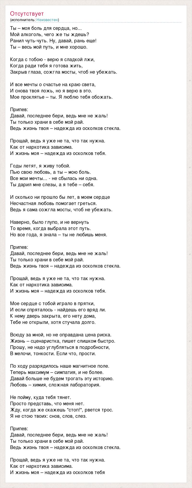 Ты – моя боль для сердца, но... Мой алкоголь, чего же ты ждешь? Ранил чуть-чуть. Ну, давай, рань еще! Ты – весь мой путь, и мне хорошо. Когда с тобою - верю я сладкой лжи, Когда ради тебя я готова жить, Закрыв глаза, сожгла мосты, чтоб не убежать. И все мечты о счастье на краю света, И снова твоя ложь, но я верю в это. Мое проклятье – ты. Я люблю тебя обожать. Припев: Давай, последнее бери, ведь мне не жаль! Ты только храни в себе мой рай. Ведь жизнь твоя – надежда из осколков стекла. Прощай, ведь я уже не та, что так нужна. Как от наркотика зависима. И жизнь моя – надежда из осколков тебя. Годы летят, я живу тобой. Пью свою любовь, а ты – мою боль. Все мои мечты... - не сбылась ни одна. Ты дарил мне слезы, а я тебе – себя. И сколько ни прошло бы лет, в моем сердце Несчастная любовь помогает греться. Ведь я сама сожгла мосты, чтоб не убежать. Наверно, было глупо, и не вернуть То время, когда выбрала этот путь. Но все года, я знала – ты не любишь меня. Припев: Давай, последнее бери, ведь мне не жаль! Ты только храни в себе мой рай. Ведь жизнь твоя – надежда из осколков стекла. Прощай, ведь я уже не та, что так нужна. Как от наркотика зависима. И жизнь моя – надежда из осколков тебя. Мое сердце с тобой играло в прятки, И если спряталось - найдешь его вряд ли. К нему дверь закрыта, его нету дома, Тебе не открыли, хотя стучала долго. Всюду за мной, но не оправдана цена риска. Жизнь – сценаристка, пишет слишком быстро. Прошу, не надо углубляться в подробности, В мелочи, тонкости. Если что, прости. По ходу разрядилось наше магнитное поле. Теперь максимум – симпатия, и не более. Давай больше не будем трогать эту историю. Любовь – химия, сложная лаборатория. Не пойму, куда тебя тянет. Просто представь, что меня нет. Жду, когда же скажешь "стоп!", рвется трос. Я не стою твоих: снов, слов, слез. Припев: Давай, последнее бери, ведь мне не жаль! Ты только храни в себе мой рай. Ведь жизнь твоя – надежда из осколков стекла. Прощай, ведь я уже не та, что так нужна. Как от наркотика зависима. И жизнь моя – надежда из осколков тебя