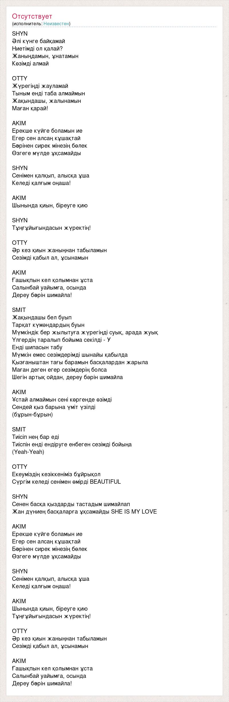 SHYN Əлі күнге байқамай Ниетімді ол қалай? Жаныңдамын, ұнатамын Көзімді алмай OTTY Жүрегіңді жауламай Тыным енді таба алмаймын Жақындашы, жалынамын Маған қарай! AKIM Ерекше күйге боламын ие Егер сен алсаң кұшақтай Бəрінен сирек мінезің бөлек Өзгеге мүлде ұқсамайды SHYN Сенімен қалқып, алысқа ұша Келеді қалғым оңаша! AKIM Шынында қиын, біреуге қию SHYN Тұңғұйығындасын жүректің! OTTY Əр кез қиын жаныңнан табыламын Сезімді қабыл ал, ұсынамын AKIM Ғашықпын кел қолымнан ұста Салынбай уайымға, осында Дереу бəрін шимайла! SMIT Жақындашы бел буып Тарқат күмәндардың буын Мүмкіндік бер жылытуға жүрегіңді суық, арада жуық Үлгердің таралып бойыма секілді - У Енді шипасын табу Мүмкін емес сезімдерімді шынайы қабылда Қызғаныштан тағы барамын басқалардан жарыла Маған деген егер сезімдерің болса Шегін артық ойдан, дереу бәрін шимайла AKIM Ұстай алмаймын сені көргенде өзімді Сендей қыз барына үміт үзілді (бұрын-бұрын) SMIT Тиісіп нең бар еді Тиіспін енді ендіруге енбеген сезімді бойыңа (Yeah-Yeah) OTTY Екеуміздің кезіккеніміз бұйрықол Сүргім келеді сенімен өмірді BEAUTIFUL SHYN Сенен басқа қыздарды тастадым шимайлап Жан дүниең басқаларға ұқсамайды SHE IS MY LOVE AKIM Ерекше күйге боламын ие Егер сен алсаң кұшақтай Бəрінен сирек мінезің бөлек Өзгеге мүлде ұқсамайды SHYN Сенімен қалқып, алысқа ұша Келеді қалғым оңаша! AKIM Шынында қиын, біреуге қию Тұңғұйығындасын жүректің! OTTY Əр кез қиын жаныңнан табыламын Сезімді қабыл ал, ұсынамын AKIM Ғашықпын кел қолымнан ұста Салынбай уайымға, осында Дереу бəрін шимайла!
