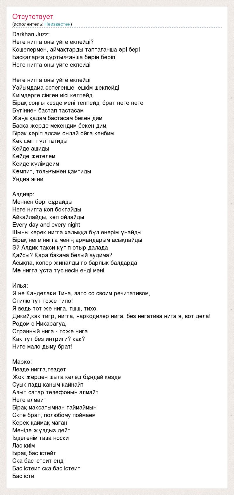 Darkhan Juzz: Неге нигга оны уйге екпейді? Көшелермен, аймақтарды таптағанша əрі бері Басқаларға құртылғанша бəрін беріп Неге нигга оны уйге екпейді Неге нигга оны уйге екпейді Уайымдама өспегенше ешкім шекпейді Киімдерге сінген иісі кетпейді Бірақ соңғы кезде мені теппейді брат неге неге Бүгіннен бастап тастасам Жаңа қадам бастасам бекен дим Басқа жерде мекендим бекен дим, Бiрак көріп алсам ондай ойга көнбим Көк шөп гүл татиды Кейде ашиды Кейде жөтелем Кейде күлімдейм Кəмпит, толығымен қамтиды Ундия яғни Алдияр: Меннен бəрі сұрайды Неге нигга көп боқтайды Айқайлайды, көп ойлайды Every day and every night Шыны керек нигга халыққа бұл өнерім ұнайды Бірақ неге нигга менің армандарым асықпайды Эй Алдик такси күтіп отыр далада Қайсы? Қара бэхама белый аудима? Асықпа, копер жиналды го барлык балдарда Мə нигга ұста түсінесін енді мені Илья: Я не Канделаки Тина, зато со своим речитативом, Стилю тут тоже типо! Я ведь тот же нига. тшш, тихо. Дикий,как тигр, нигга, наркодилер нига, без негатива нига я, вот дела! Родом с Никарагуа, Странный нига - тоже нига Как тут без интриги? как? Ниге мало дыму брат! Марко: Лезде нигга,тездет Жок жерден шыға келед бұндай кезде Суық пздц каным кайнайт Алып сатар телефонын алмайт Неге алмаит Бірақ мақсатымнан таймаймын Скпе брат, полюбому поймаем Керек қаймақ маған Меніде жұлдыз дейт Іздегенім таза носки Лас киім Бірақ бас істейт Ска бас істеит енді Бас істеит ска бас істеит Бас істи
