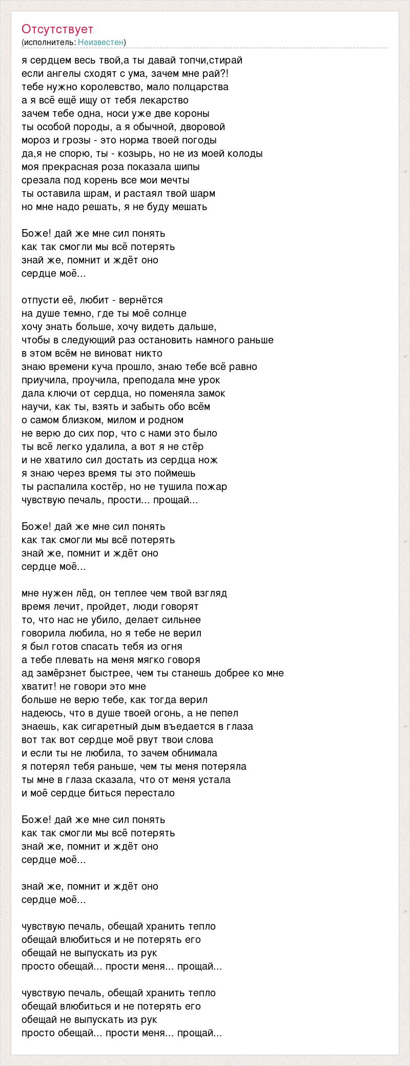 я сердцем весь твой,а ты давай топчи,стирай если ангелы сходят с ума, зачем мне рай?! тебе нужно королевство, мало полцарства а я всё ещё ищу от тебя лекарство зачем тебе одна, носи уже две короны ты особой породы, а я обычной, дворовой мороз и грозы - это норма твоей погоды да,я не спорю, ты - козырь, но не из моей колоды моя прекрасная роза показала шипы срезала под корень все мои мечты ты оставила шрам, и растаял твой шарм но мне надо решать, я не буду мешать Боже! дай же мне сил понять как так смогли мы всё потерять знай же, помнит и ждёт оно сердце моё... отпусти её, любит - вернётся на душе темно, где ты моё солнце хочу знать больше, хочу видеть дальше, чтобы в следующий раз остановить намного раньше в этом всём не виноват никто знаю времени куча прошло, знаю тебе всё равно приучила, проучила, преподала мне урок дала ключи от сердца, но поменяла замок научи, как ты, взять и забыть обо всём о самом близком, милом и родном не верю до сих пор, что с нами это было ты всё легко удалила, а вот я не стёр и не хватило сил достать из сердца нож я знаю через время ты это поймешь ты распалила костёр, но не тушила пожар чувствую печаль, прости... прощай... Боже! дай же мне сил понять как так смогли мы всё потерять знай же, помнит и ждёт оно сердце моё... мне нужен лёд, он теплее чем твой взгляд время лечит, пройдет, люди говорят то, что нас не убило, делает сильнее говорила любила, но я тебе не верил я был готов спасать тебя из огня а тебе плевать на меня мягко говоря ад замёрзнет быстрее, чем ты станешь добрее ко мне хватит! не говори это мне больше не верю тебе, как тогда верил надеюсь, что в душе твоей огонь, а не пепел знаешь, как сигаретный дым въедается в глаза вот так вот сердце моё рвут твои слова и если ты не любила, то зачем обнимала я потерял тебя раньше, чем ты меня потеряла ты мне в глаза сказала, что от меня устала и моё сердце биться перестало Боже! дай же мне сил понять как так смогли мы всё потерять знай же, помнит и ждёт оно сердце моё... знай же, помнит и ждёт оно сердце моё... чувствую печаль, обещай хранить тепло обещай влюбиться и не потерять его обещай не выпускать из рук просто обещай... прости меня... прощай... чувствую печаль, обещай хранить тепло обещай влюбиться и не потерять его обещай не выпускать из рук просто обещай... прости меня... прощай...