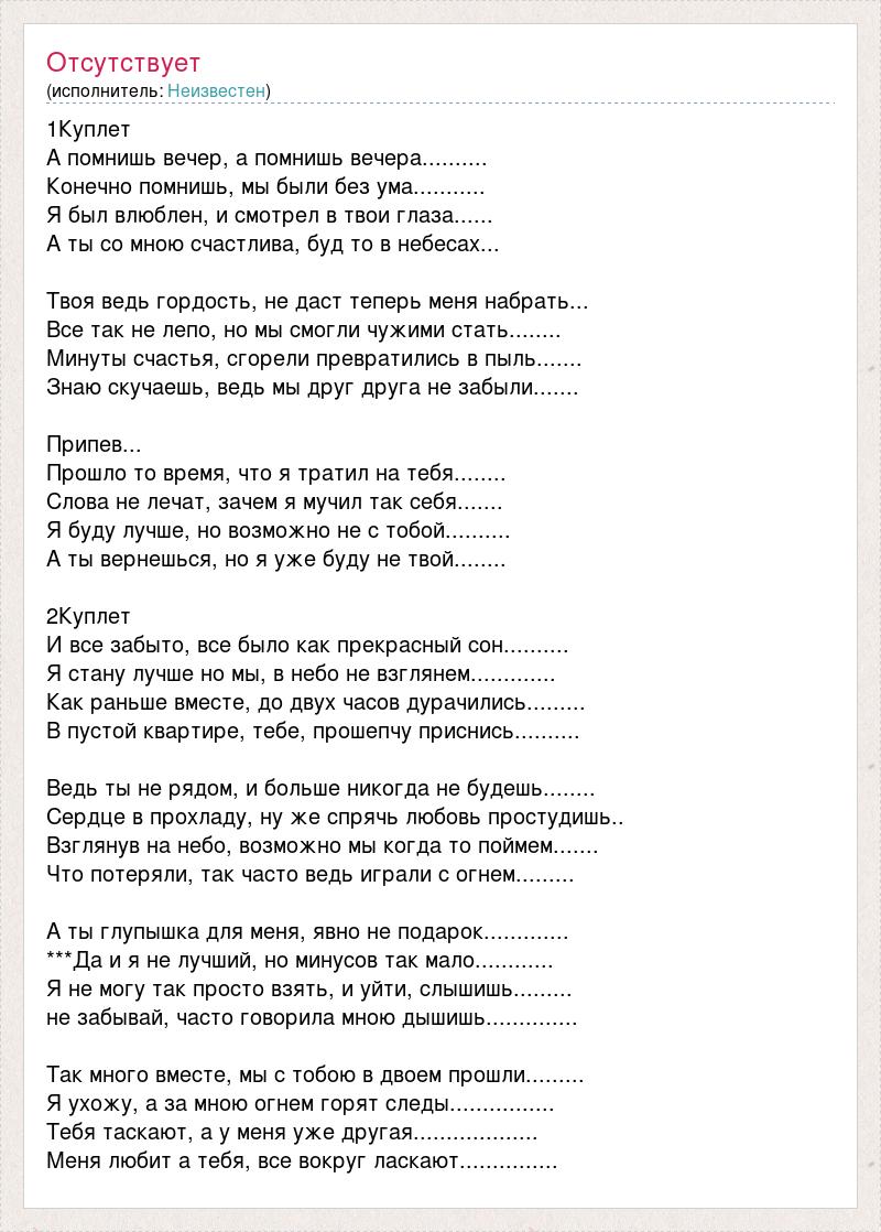 1Куплет А помнишь вечер, а помнишь вечера.......... Конечно помнишь, мы были без ума........... Я был влюблен, и смотрел в твои глаза...... А ты со мною счастлива, буд то в небесах... Твоя ведь гордость, не даст теперь меня набрать... Все так не лепо, но мы смогли чужими стать........ Минуты счастья, сгорели превратились в пыль....... Знаю скучаешь, ведь мы друг друга не забыли....... Припев... Прошло то время, что я тратил на тебя........ Слова не лечат, зачем я мучил так себя....... Я буду лучше, но возможно не с тобой.......... А ты вернешься, но я уже буду не твой........ 2Куплет И все забыто, все было как прекрасный сон.......... Я стану лучше но мы, в небо не взглянем............. Как раньше вместе, до двух часов дурачились......... В пустой квартире, тебе, прошепчу приснись.......... Ведь ты не рядом, и больше никогда не будешь........ Сердце в прохладу, ну же спрячь любовь простудишь.. Взглянув на небо, возможно мы когда то поймем....... Что потеряли, так часто ведь играли с огнем......... А ты глупышка для меня, явно не подарок............. ***Да и я не лучший, но минусов так мало............ Я не могу так просто взять, и уйти, слышишь......... не забывай, часто говорила мною дышишь.............. Так много вместе, мы с тобою в двоем прошли......... Я ухожу, а за мною огнем горят следы................ Тебя таскают, а у меня уже другая................... Меня любит а тебя, все вокруг ласкают...............