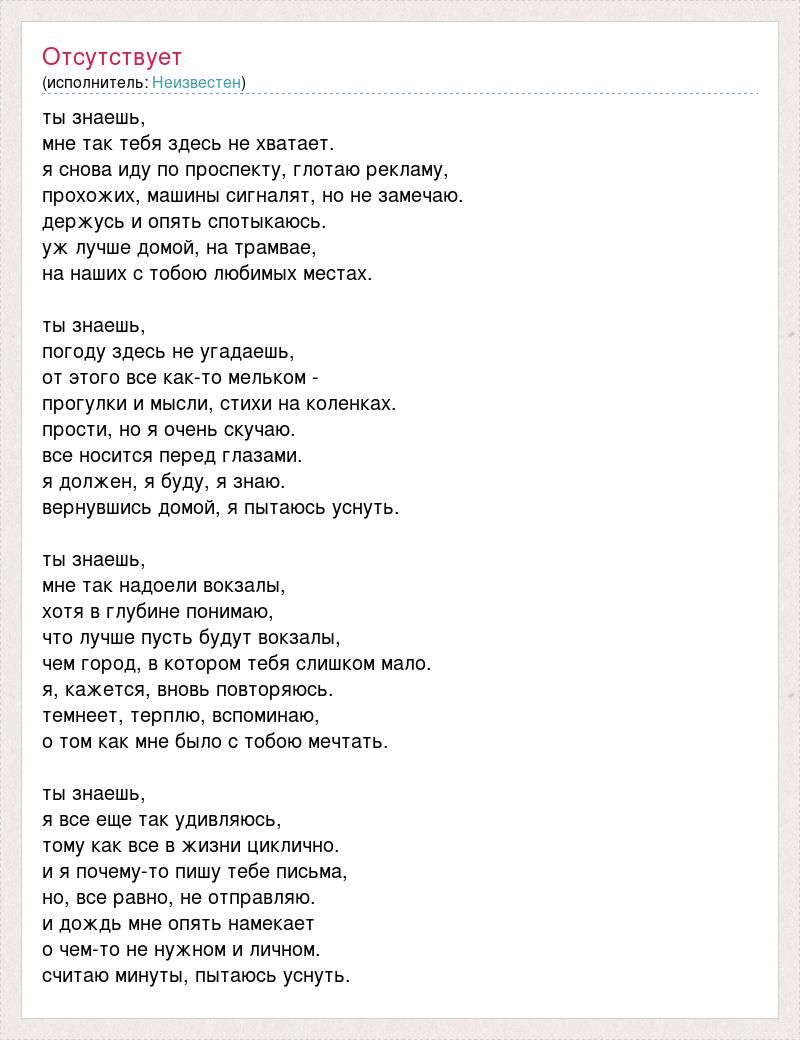 ты знаешь, мне так тебя здесь не хватает. я снова иду по проспекту, глотаю рекламу, прохожих, машины сигналят, но не замечаю. держусь и опять спотыкаюсь. уж лучше домой, на трамвае, на наших с тобою любимых местах. ты знаешь, погоду здесь не угадаешь, от этого все как-то мельком - прогулки и мысли, стихи на коленках. прости, но я очень скучаю. все носится перед глазами. я должен, я буду, я знаю. вернувшись домой, я пытаюсь уснуть. ты знаешь, мне так надоели вокзалы, хотя в глубине понимаю, что лучше пусть будут вокзалы, чем город, в котором тебя слишком мало. я, кажется, вновь повторяюсь. темнеет, терплю, вспоминаю, о том как мне было с тобою мечтать. ты знаешь, я все еще так удивляюсь, тому как все в жизни циклично. и я почему-то пишу тебе письма, но, все равно, не отправляю. и дождь мне опять намекает о чем-то не нужном и личном. считаю минуты, пытаюсь уснуть.