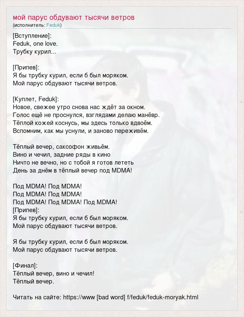 [Вступление]: Feduk, one love. Трубку курил... [Припев]: Я бы трубку курил, если б был моряком. Мой парус обдувают тысячи ветров. [Куплет, Feduk]: Новое, свежее утро снова нас ждёт за окном. Голос ещё не проснулся, взглядами делаю манёвр. Тёплой кожей коснусь, мы здесь только вдвоём. Вспомним, как мы уснули, и заново переживём. Тёплый вечер, саксофон живьём. Вино и чечил, задние ряды в кино Ничто не вечно, но с тобой я готов лететь День за днём в тёплый вечер под MDMA! Под MDMA! Под MDMA! Под MDMA! Под MDMA! Под MDMA! Под MDMA! Под MDMA! [Припев]: Я бы трубку курил, если б был моряком. Мой парус обдувают тысячи ветров. Я бы трубку курил, если б был моряком. Мой парус обдувают тысячи ветров. [Финал]: Тёплый вечер, вино и чечил! Тёплый вечер. Читать на сайте: https://www [bad word] f/feduk/feduk-moryak.html