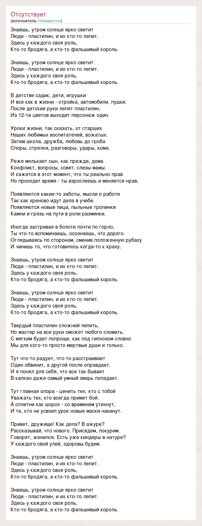 Знаешь, утром солнце ярко светит Люди - пластилин, и их кто-то лепит. Здесь у каждого своя роль, Кто-то бродяга, а кто-то фальшивый король. Знаешь, утром солнце ярко светит Люди - пластилин, и их кто-то лепит. Здесь у каждого своя роль, Кто-то бродяга, а кто-то фальшивый король. В детстве садик, дети, игрушки И все как в жизни - стройка, автомобили, пушки. После детские руки лепят пластилин, Из 12-ти цветов выходит персонаж один. Уроки жизни, так сказать, от старших Наших любимых воспитателей, вожатых. Затем школа, дружба, любовь до гроба Споры, стрелки, разговоры, удары, кома. Реже мелькает сын, как прежде, дома Конфликт, вопросы, совет, слезы мамы. И кажется в этот момент, что ты реально прав Но проходит время - ты взрослеешь и меняется нрав. Появляются какие-то заботы, мысли о работе Так как хреново идут дела в учебе. Появляются новые лица, пыльные тропинки Камни и грязь на пути в роли разминки. Иногда застревая в болоте почти по горло, Ты что-то вспоминаешь, осознаешь, что дорого. Оглядываясь по сторонам, сменив положенную рубаху И чинишь то, что готовилось когда-то к краху. Знаешь, утром солнце ярко светит Люди - пластилин, и их кто-то лепит. Здесь у каждого своя роль, Кто-то бродяга, а кто-то фальшивый король. Знаешь, утром солнце ярко светит Люди - пластилин, и их кто-то лепит. Здесь у каждого своя роль, Кто-то бродяга, а кто-то фальшивый король. Твердый пластилин сложней лепить, Но мастер на все руки сможет любого сломить. С мягким будет попроще, как под гипнозом словно Мы для кого-то просто мертвые души и только. Тут что-то радует, что-то расстраивает Один обвинит, а другой после оправдает. И я понял для себя, что все так бывает В капкан даже самый умный зверь попадает. Тут главная опора - ценить тех, кто с тобой Уважать тех, кто всегда примет бой. А сплетни как шорох - со временем утихнут, И те, кто не усвоил урок новые маски накинут. Привет, дружище! Как дела? В ажуре? Рассказывай, что нового. Присядем, покурим. Говорят, женился. Есть уже киндеры в натуре? У каждого свой улей, здоровы будем. Знаешь, утром солнце ярко светит Люди - пластилин, и их кто-то лепит. Здесь у каждого своя роль, Кто-то бродяга, а кто-то фальшивый король. Знаешь, утром солнце ярко светит Люди - пластилин, и их кто-то лепит. Здесь у каждого своя роль, Кто-то бродяга, а кто-то фальшивый король.