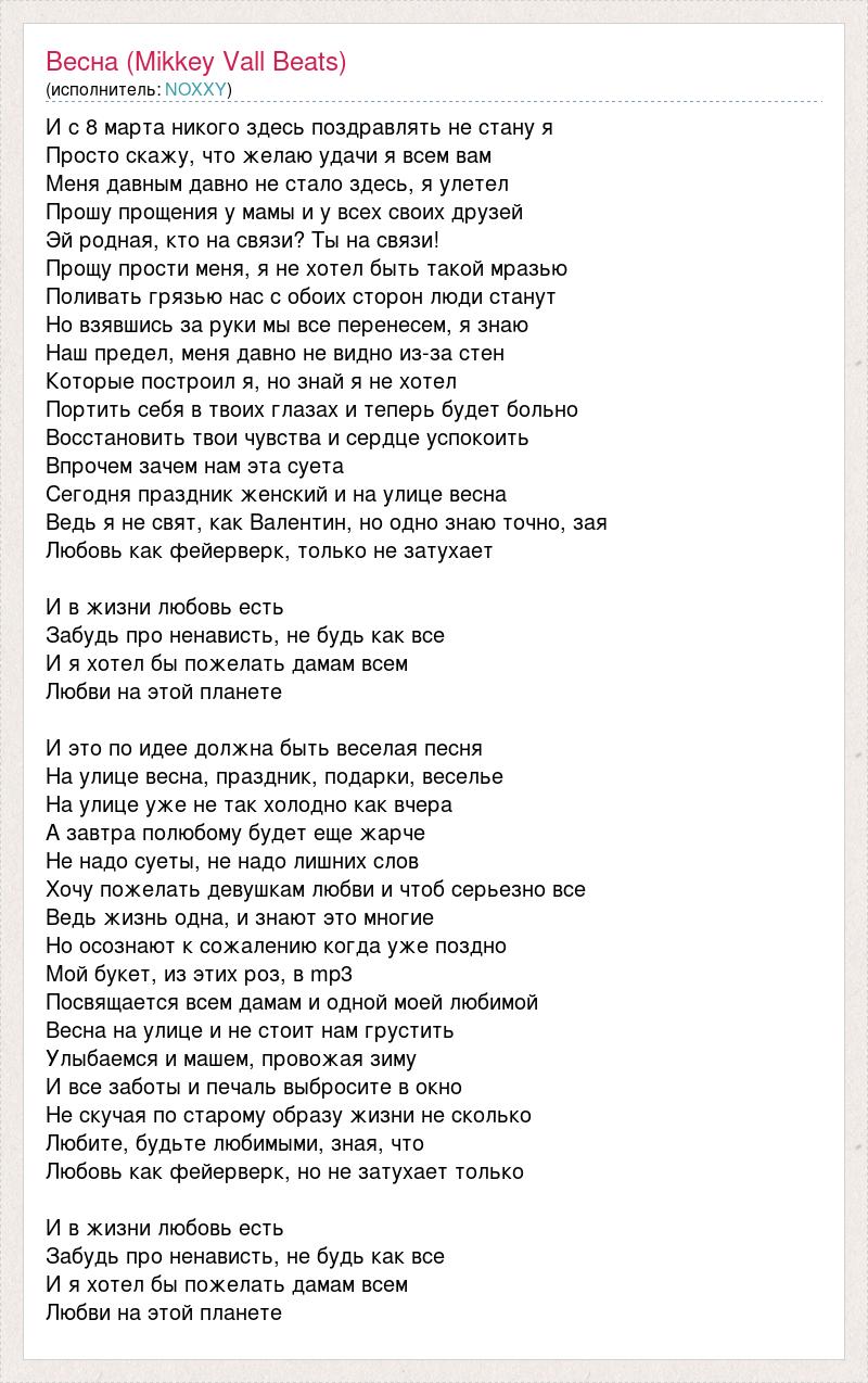 И с 8 марта никого здесь поздравлять не стану я Просто скажу, что желаю удачи я всем вам Меня давным давно не стало здесь, я улетел Прошу прощения у мамы и у всех своих друзей Эй родная, кто на связи? Ты на связи! Прощу прости меня, я не хотел быть такой мразью Поливать грязью нас с обоих сторон люди станут Но взявшись за руки мы все перенесем, я знаю Наш предел, меня давно не видно из-за стен Которые построил я, но знай я не хотел Портить себя в твоих глазах и теперь будет больно Восстановить твои чувства и сердце успокоить Впрочем зачем нам эта суета Сегодня праздник женский и на улице весна Ведь я не свят, как Валентин, но одно знаю точно, зая Любовь как фейерверк, только не затухает И в жизни любовь есть Забудь про ненависть, не будь как все И я хотел бы пожелать дамам всем Любви на этой планете И это по идее должна быть веселая песня На улице весна, праздник, подарки, веселье На улице уже не так холодно как вчера А завтра полюбому будет еще жарче Не надо суеты, не надо лишних слов Хочу пожелать девушкам любви и чтоб серьезно все Ведь жизнь одна, и знают это многие Но осознают к сожалению когда уже поздно Мой букет, из этих роз, в mp3 Посвящается всем дамам и одной моей любимой Весна на улице и не стоит нам грустить Улыбаемся и машем, провожая зиму И все заботы и печаль выбросите в окно Не скучая по старому образу жизни не сколько Любите, будьте любимыми, зная, что Любовь как фейерверк, но не затухает только И в жизни любовь есть Забудь про ненависть, не будь как все И я хотел бы пожелать дамам всем Любви на этой планете