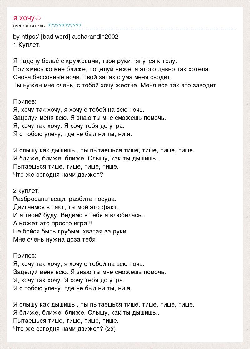 by https:/ [bad word] a.sharandin2002 1 Куплет. Я надену бельё с кружевами, твои руки тянутся к телу. Прижмись ко мне ближе, поцелуй ниже, я этого давно так хотела. Снова бессонные ночи. Твой запах с ума меня сводит. Ты нужен мне очень, с тобой хочу жестче. Меня все так это заводит. Припев: Я, хочу так хочу, я хочу с тобой на всю ночь. Зацелуй меня всю. Я знаю ты мне сможешь помочь. Я, хочу так хочу. Я хочу тебя до утра. Я с тобою улечу, где не был ни ты, ни я. Я слышу как дышишь , ты пытаешься тише, тише, тише, тише. Я ближе, ближе, ближе. Слышу, как ты дышишь.. Пытаешься тише, тише, тише, тише. Что же сегодня нами движет? 2 куплет. Разбросаны вещи, разбита посуда. Двигаемся в такт, ты мой это факт. И я твоей буду. Видимо в тебя я влюбилась.. А может это просто игра?! Не бойся быть грубым, хватая за руки. Мне очень нужна доза тебя Припев: Я, хочу так хочу, я хочу с тобой на всю ночь. Зацелуй меня всю. Я знаю ты мне сможешь помочь. Я, хочу так хочу. Я хочу тебя до утра. Я с тобою улечу, где не был ни ты, ни я. Я слышу как дышишь , ты пытаешься тише, тише, тише, тише. Я ближе, ближе, ближе. Слышу, как ты дышишь.. Пытаешься тише, тише, тише, тише. Что же сегодня нами движет? (2х)
