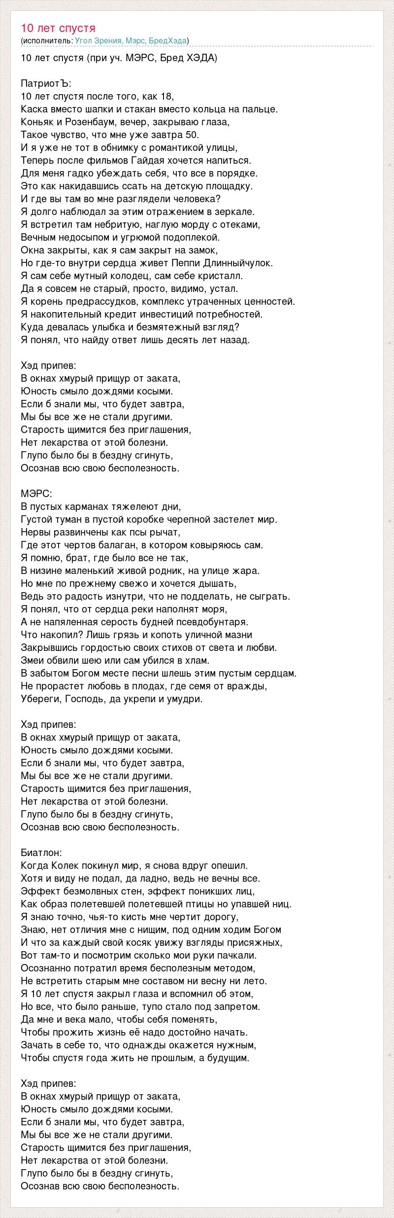 10 лет спустя (при уч. МЭРС, Бред ХЭДА) ПатриотЪ: 10 лет спустя после того, как 18, Каска вместо шапки и стакан вместо кольца на пальце. Коньяк и Розенбаум, вечер, закрываю глаза, Такое чувство, что мне уже завтра 50. И я уже не тот в обнимку с романтикой улицы, Теперь после фильмов Гайдая хочется напиться. Для меня гадко убеждать себя, что все в порядке. Это как накидавшись ссать на детскую площадку. И где вы там во мне разглядели человека? Я долго наблюдал за этим отражением в зеркале. Я встретил там небритую, наглую морду с отеками, Вечным недосыпом и угрюмой подоплекой. Окна закрыты, как я сам закрыт на замок, Но где-то внутри сердца живет Пеппи Длинныйчулок. Я сам себе мутный колодец, сам себе кристалл. Да я совсем не старый, просто, видимо, устал. Я корень предрассудков, комплекс утраченных ценностей. Я накопительный кредит инвестиций потребностей. Куда девалась улыбка и безмятежный взгляд? Я понял, что найду ответ лишь десять лет назад. Хэд припев: В окнах хмурый прищур от заката, Юность смыло дождями косыми. Если б знали мы, что будет завтра, Мы бы все же не стали другими. Старость щимится без приглашения, Нет лекарства от этой болезни. Глупо было бы в бездну сгинуть, Осознав всю свою бесполезность. МЭРС: В пустых карманах тяжелеют дни, Густой туман в пустой коробке черепной застелет мир. Нервы развинчены как псы рычат, Где этот чертов балаган, в котором ковыряюсь сам. Я помню, брат, где было все не так, В низине маленький живой родник, на улице жара. Но мне по прежнему свежо и хочется дышать, Ведь это радость изнутри, что не подделать, не сыграть. Я понял, что от сердца реки наполнят моря, А не напяленная серость будней псевдобунтаря. Что накопил? Лишь грязь и копоть уличной мазни Закрывшись гордостью своих стихов от света и любви. Змеи обвили шею или сам убился в хлам. В забытом Богом месте песни шлешь этим пустым сердцам. Не прорастет любовь в плодах, где семя от вражды, Убереги, Господь, да укрепи и умудри. Хэд припев: В окнах хмурый прищур от заката, Юность смыло дождями косыми. Если б знали мы, что будет завтра, Мы бы все же не стали другими. Старость щимится без приглашения, Нет лекарства от этой болезни. Глупо было бы в бездну сгинуть, Осознав всю свою бесполезность. Биатлон: Когда Колек покинул мир, я снова вдруг опешил. Хотя и виду не подал, да ладно, ведь не вечны все. Эффект безмолвных стен, эффект поникших лиц, Как образ полетевшей полетевшей птицы но упавшей ниц. Я знаю точно, чья-то кисть мне чертит дорогу, Знаю, нет отличия мне с нищим, под одним ходим Богом И что за каждый свой косяк увижу взгляды присяжных, Вот там-то и посмотрим сколько мои руки пачкали. Осознанно потратил время бесполезным методом, Не встретить старым мне составом ни весну ни лето. Я 10 лет спустя закрыл глаза и вспомнил об этом, Но все, что было раньше, тупо стало под запретом. Да мне и века мало, чтобы себя поменять, Чтобы прожить жизнь её надо достойно начать. Зачать в себе то, что однажды окажется нужным, Чтобы спустя года жить не прошлым, а будущим. Хэд припев: В окнах хмурый прищур от заката, Юность смыло дождями косыми. Если б знали мы, что будет завтра, Мы бы все же не стали другими. Старость щимится без приглашения, Нет лекарства от этой болезни. Глупо было бы в бездну сгинуть, Осознав всю свою бесполезность.